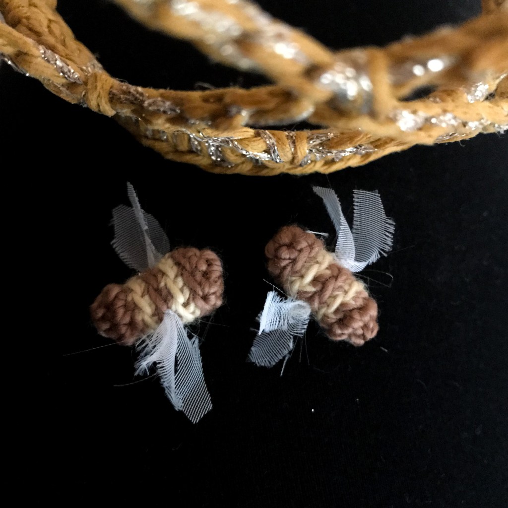 Coton, laine teinte (teinture végétale) et fil de lurex crochetés.