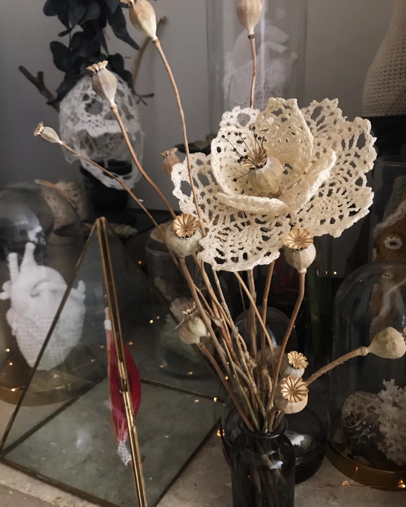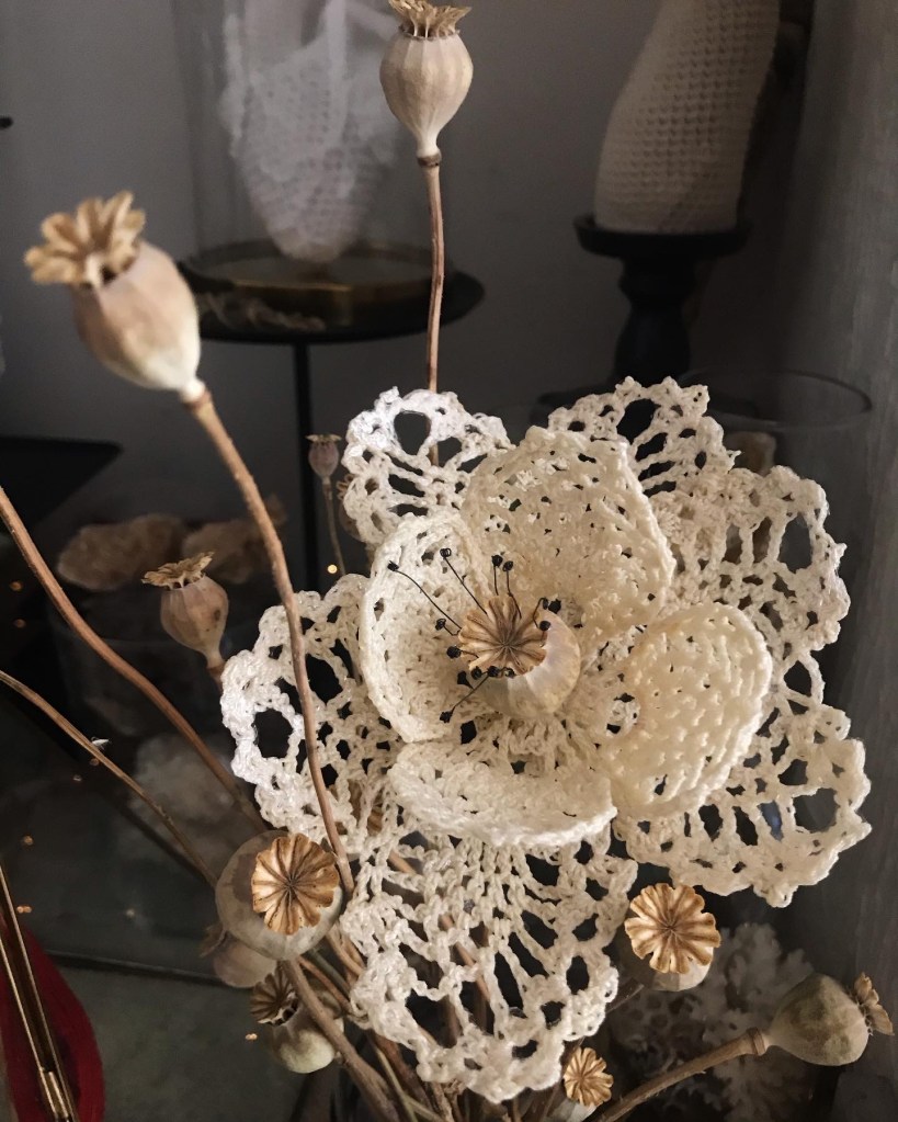Installation de fleurs de pavots séchées, pétales crochetés au fil de coton mercerisé, colle, fil de fer.