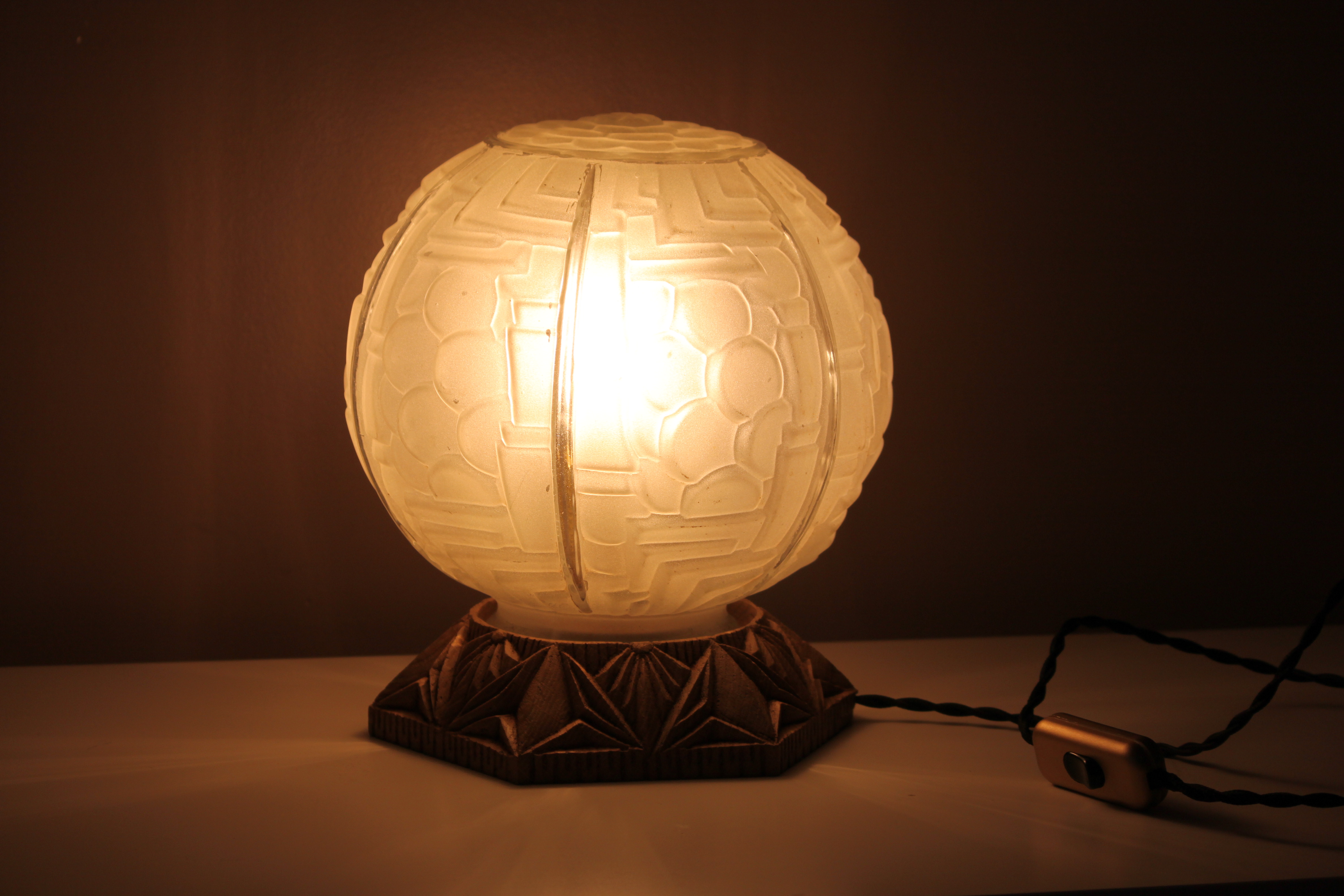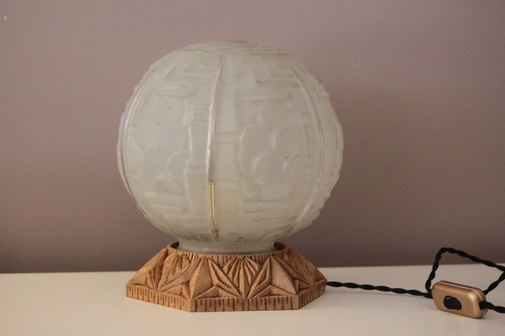 Tilleul sculpté, feuilles d’or 23 carats, noyer, globe art déco