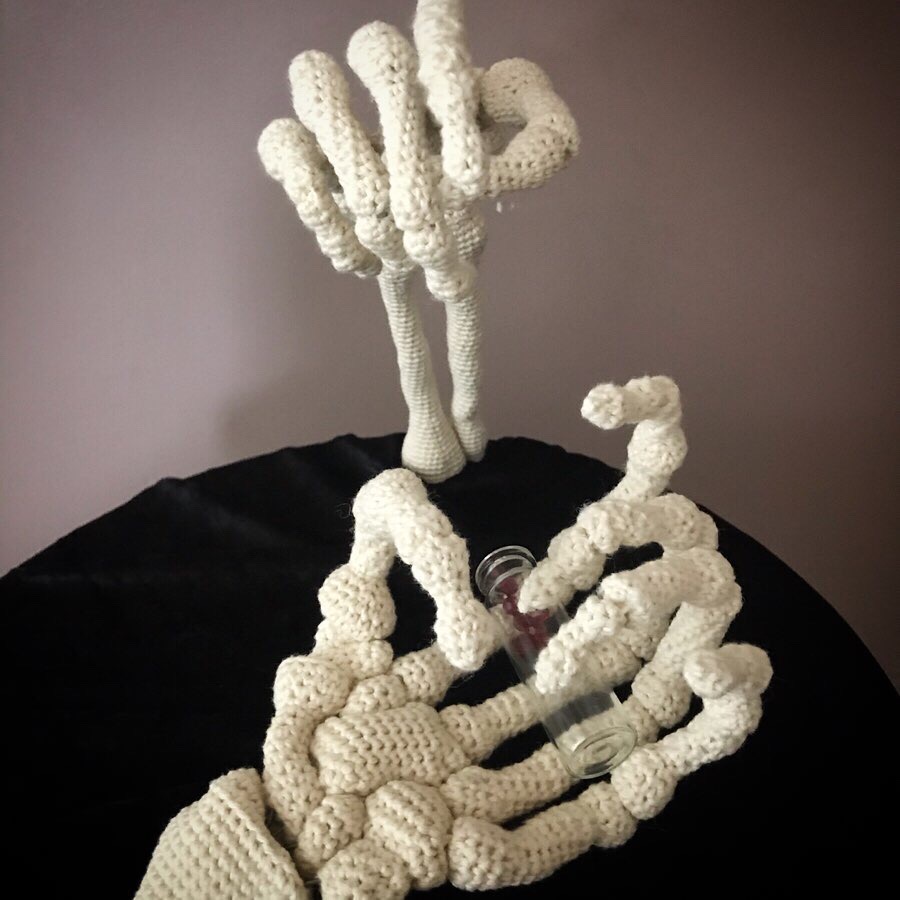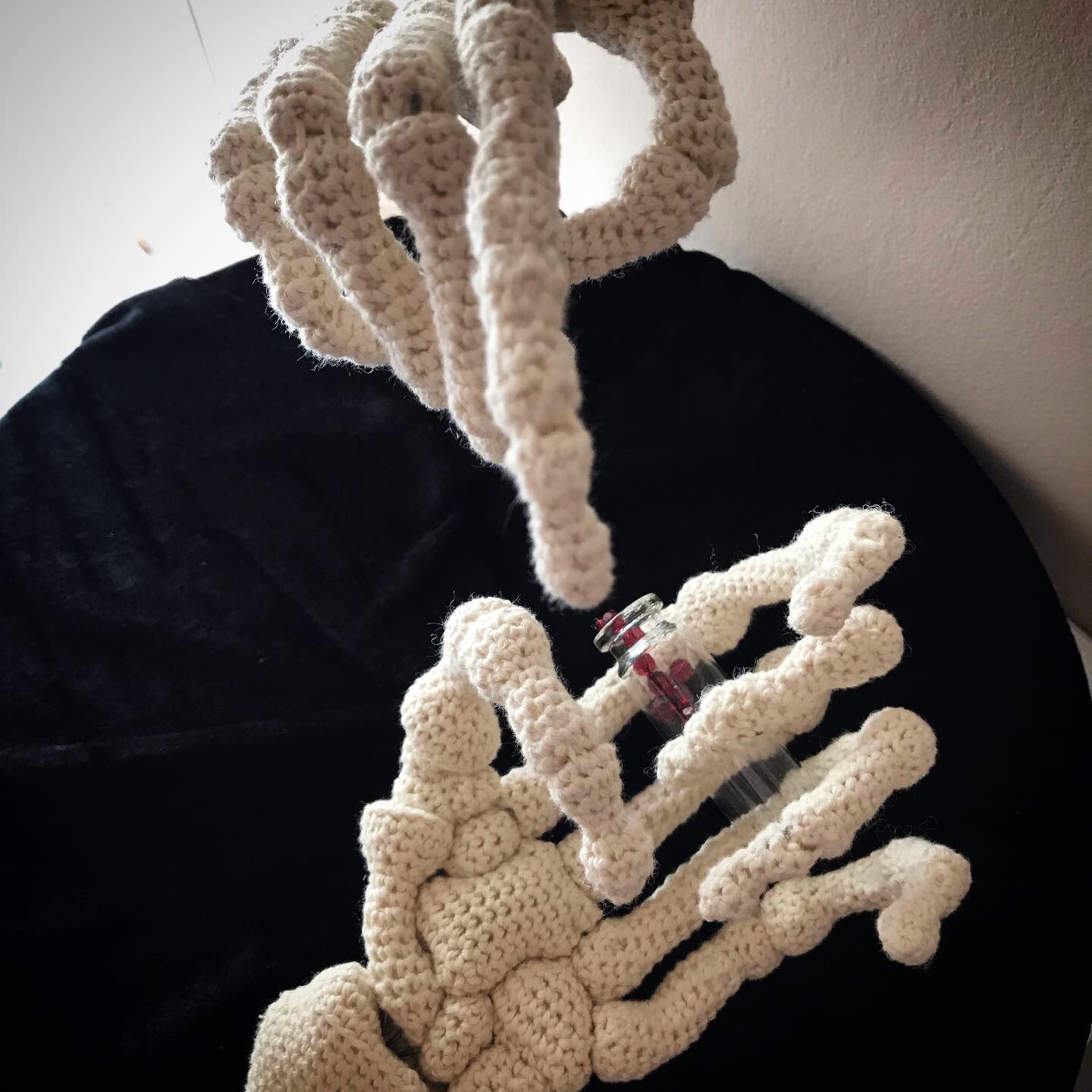 Coton crocheté, fil de fer galvanisé et polyester sur socle de bois et panne de velours.