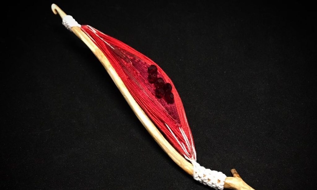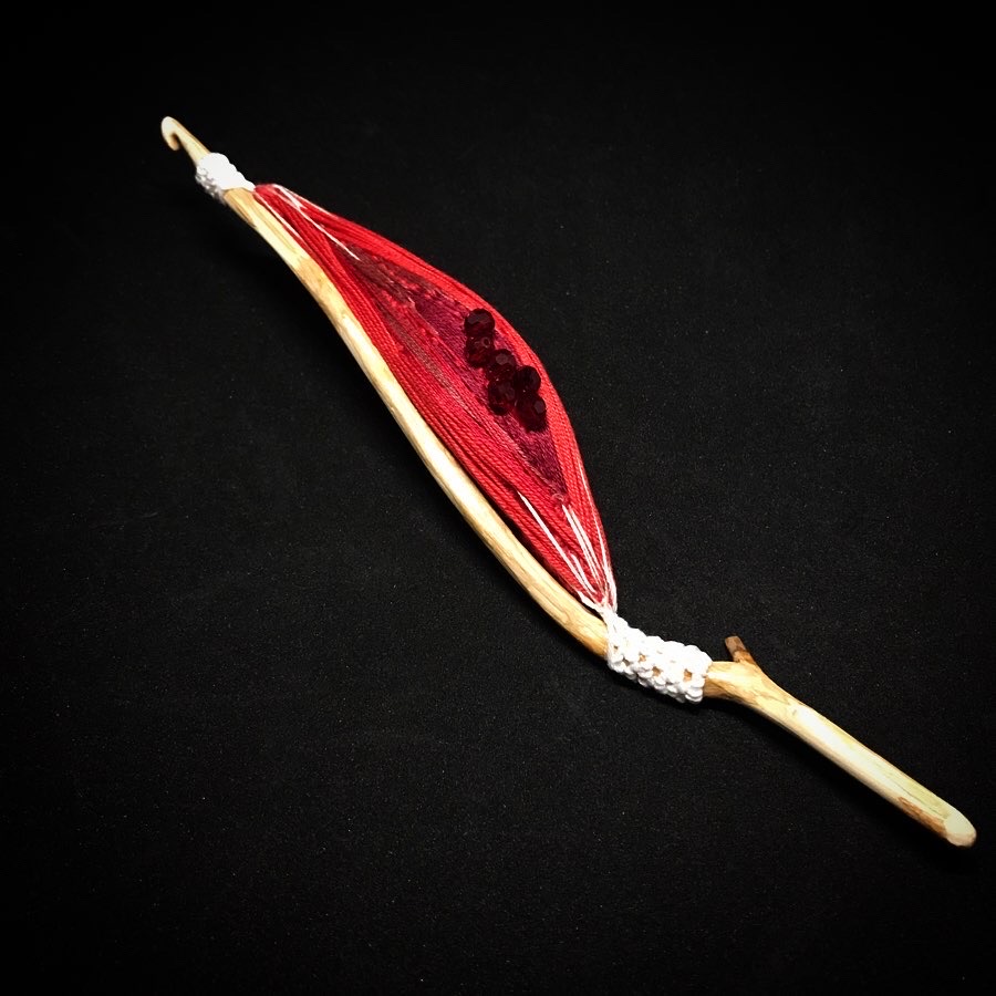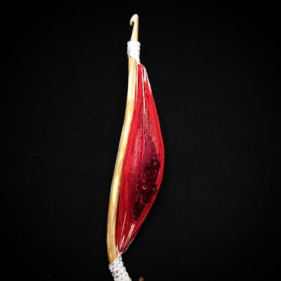 Coton crocheté, et brodé sur bois sculpté.
