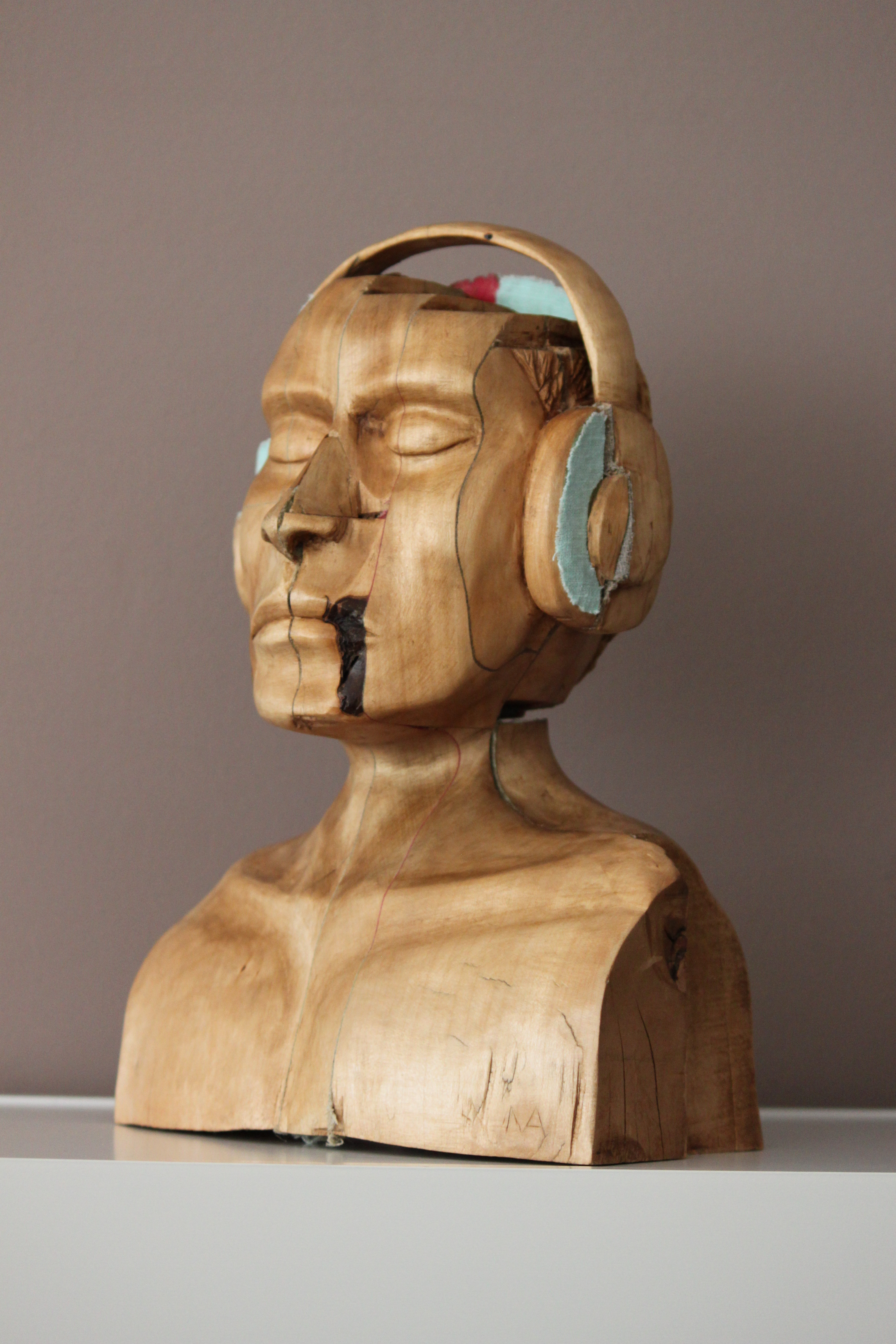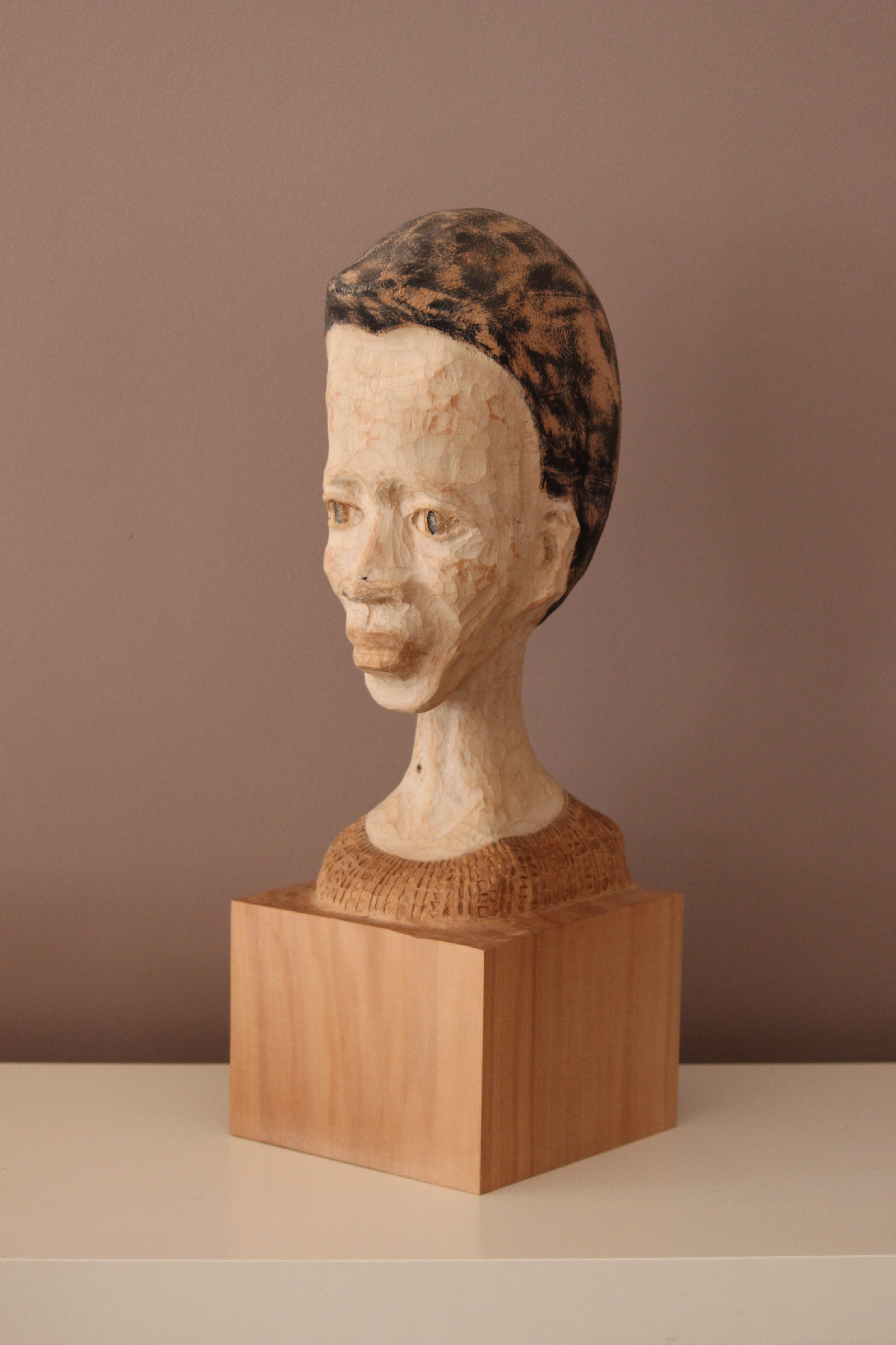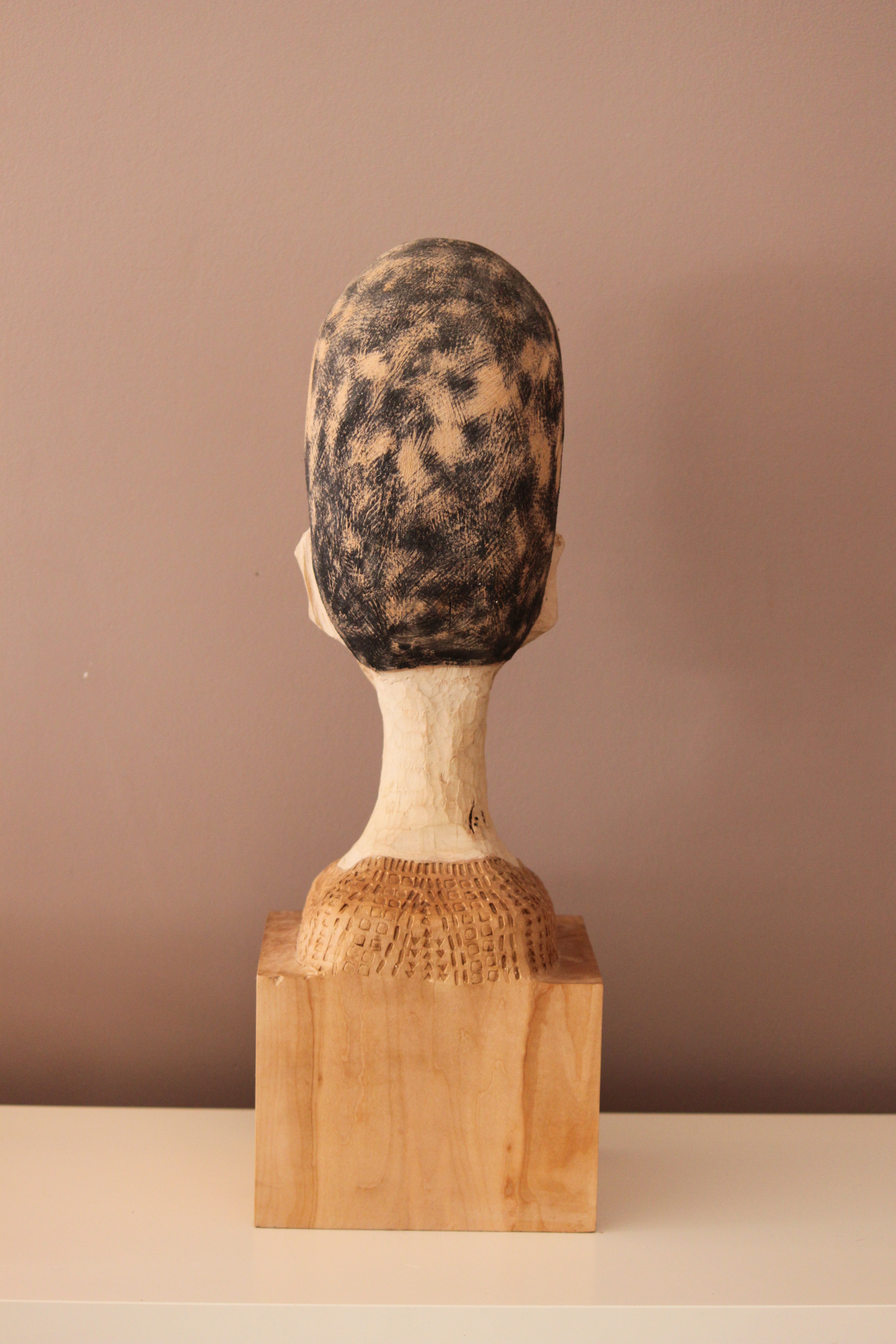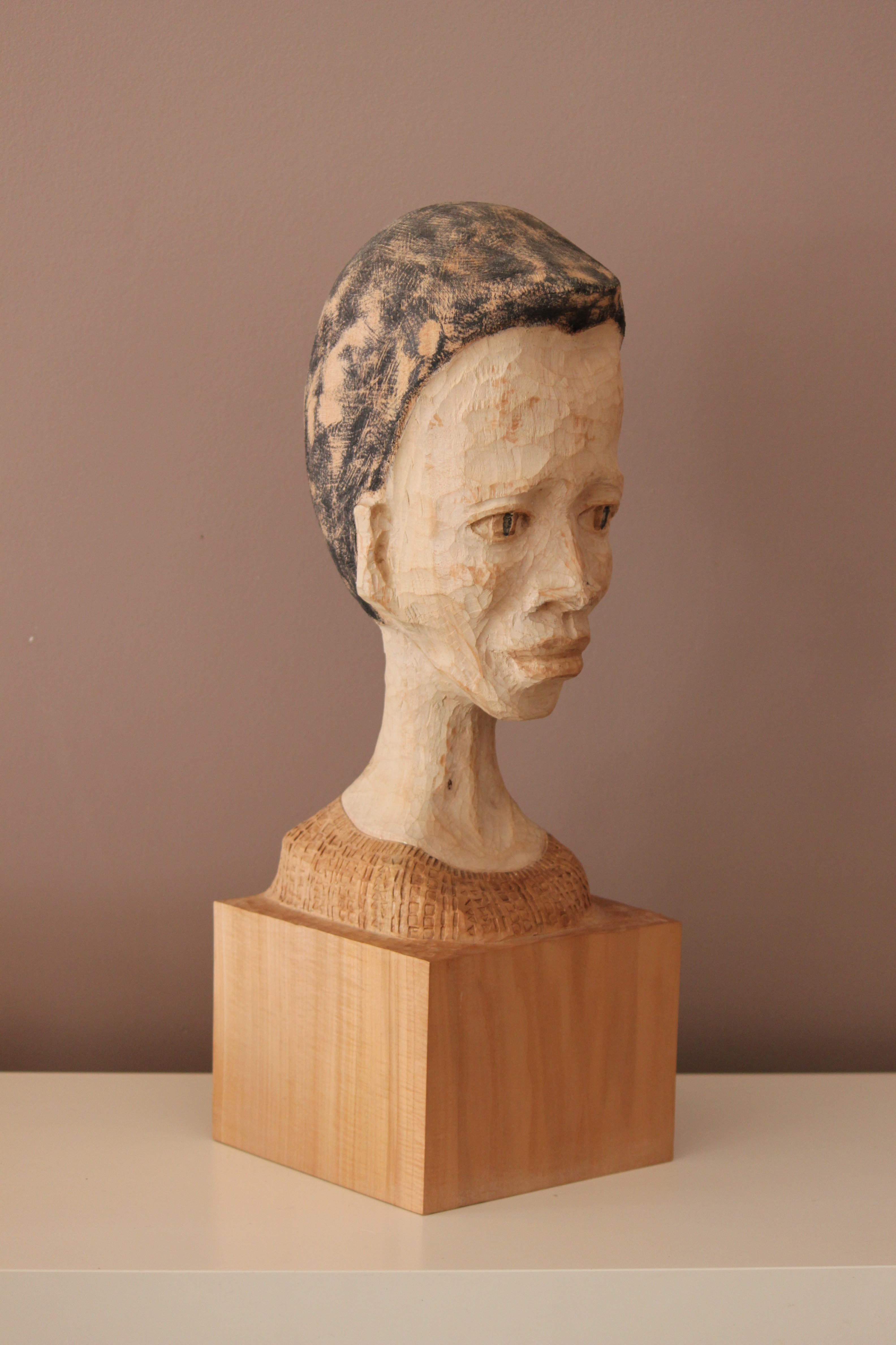 Buste sculpté en merisier et tilleul (chutes) et lin rose, bleu et gris (chutes)