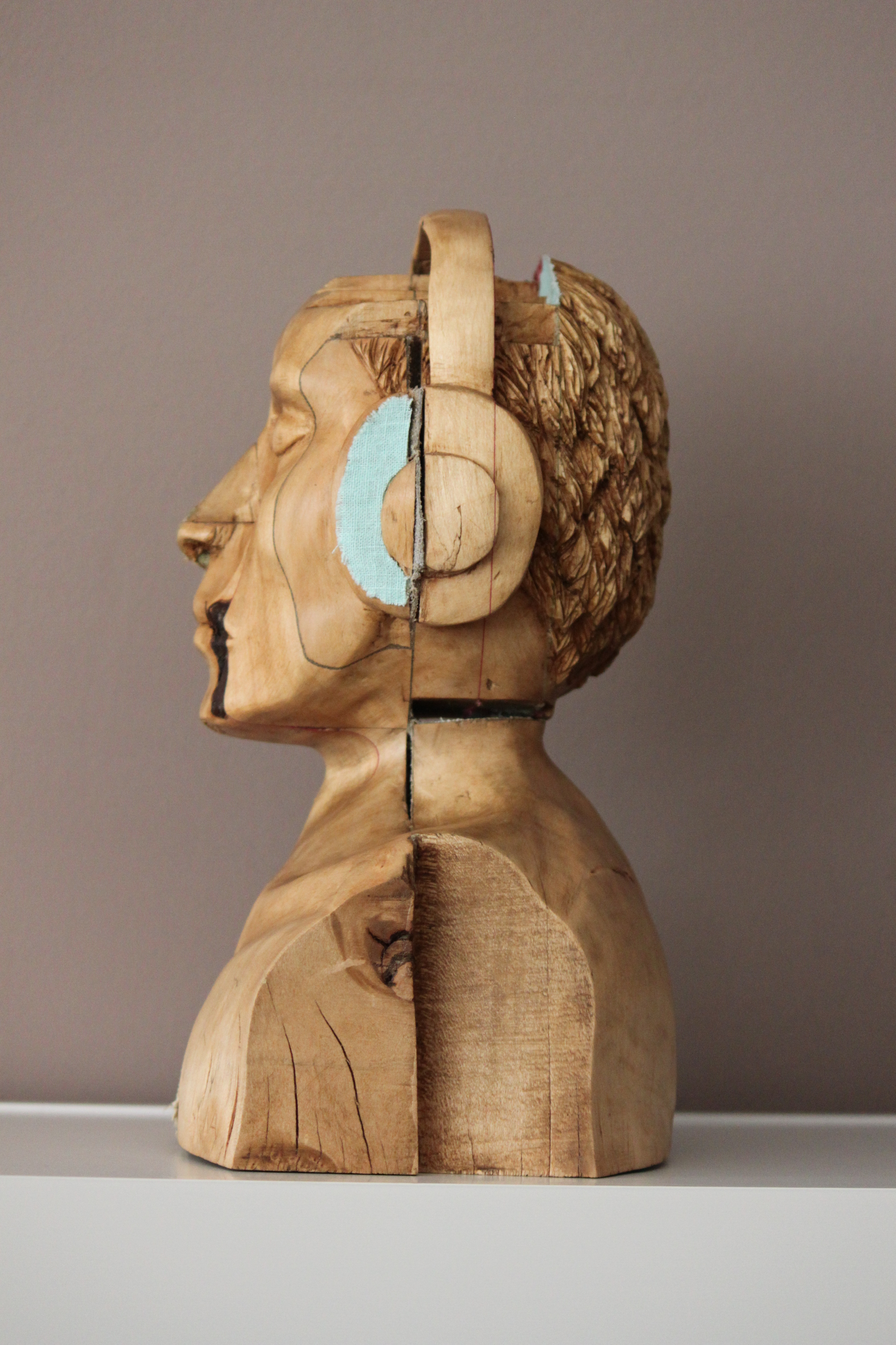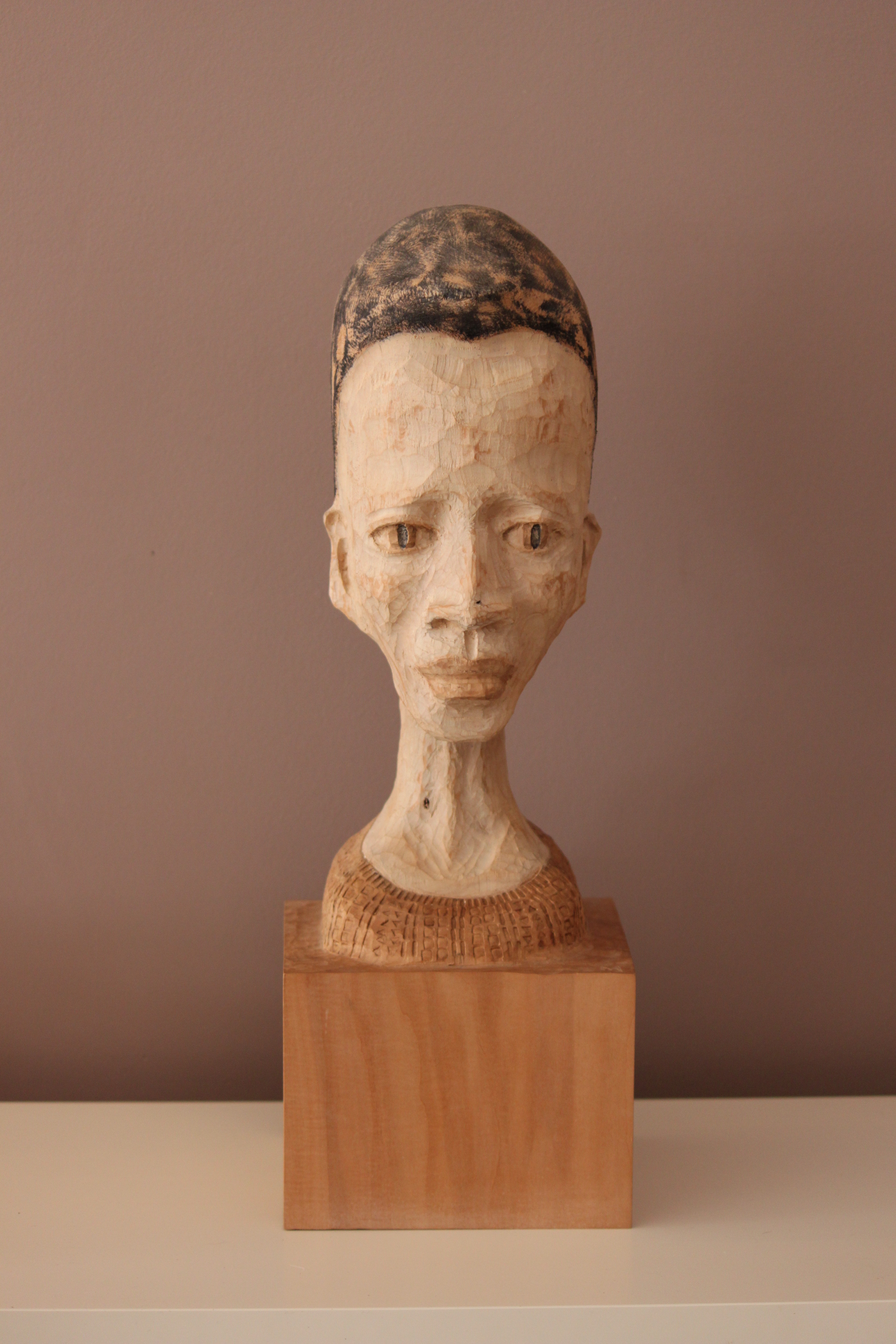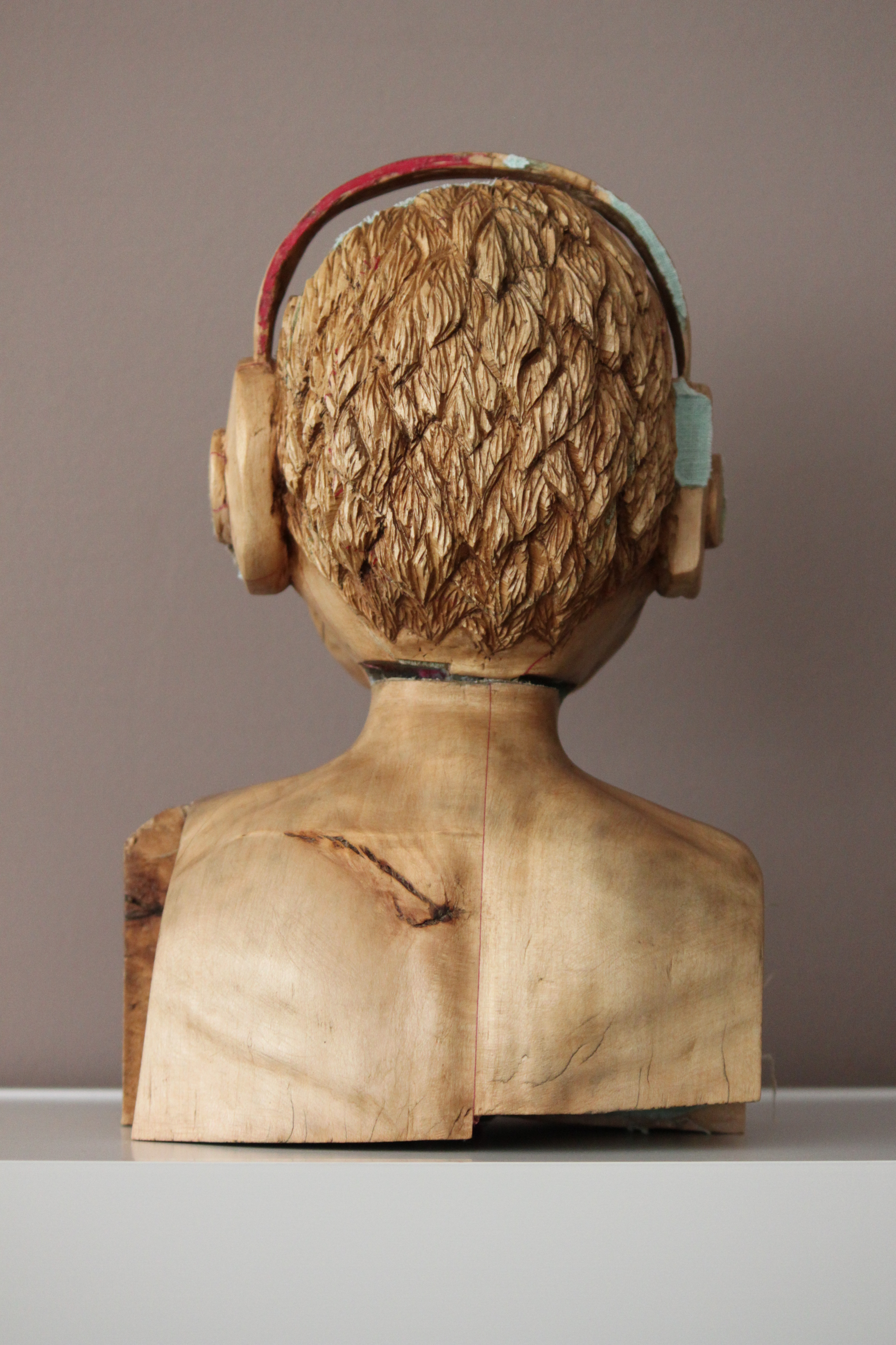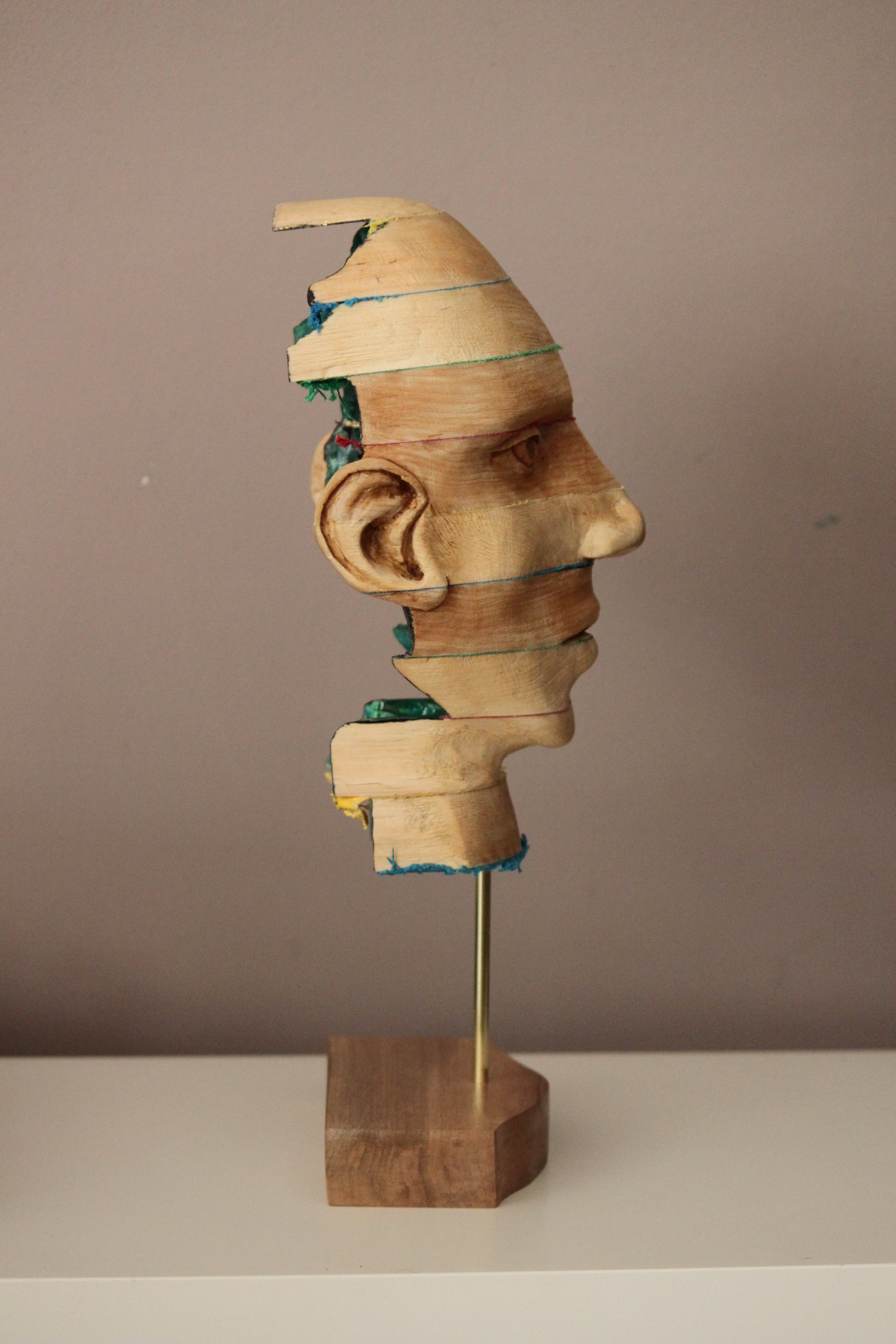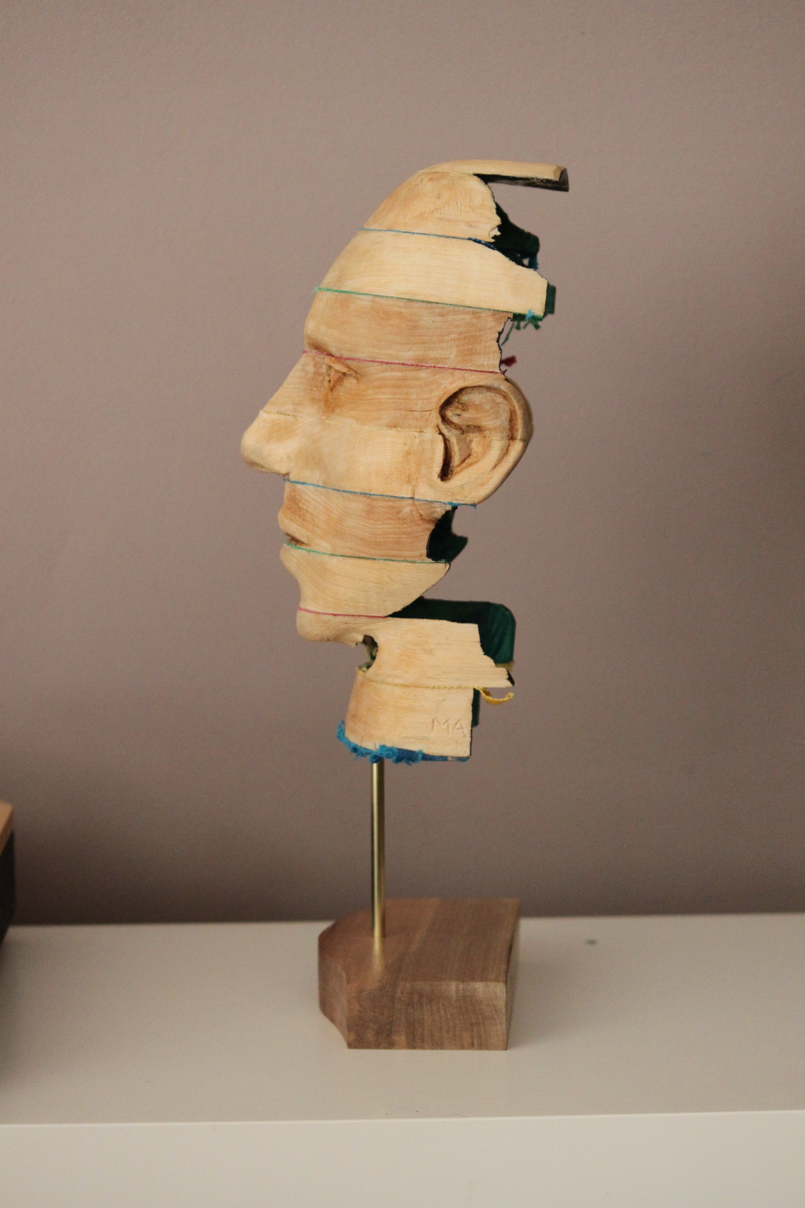 Buste sculpté en merisier et tilleul (chutes) et lin rose, bleu et gris (chutes)