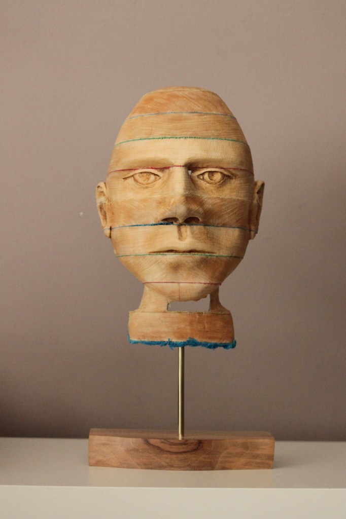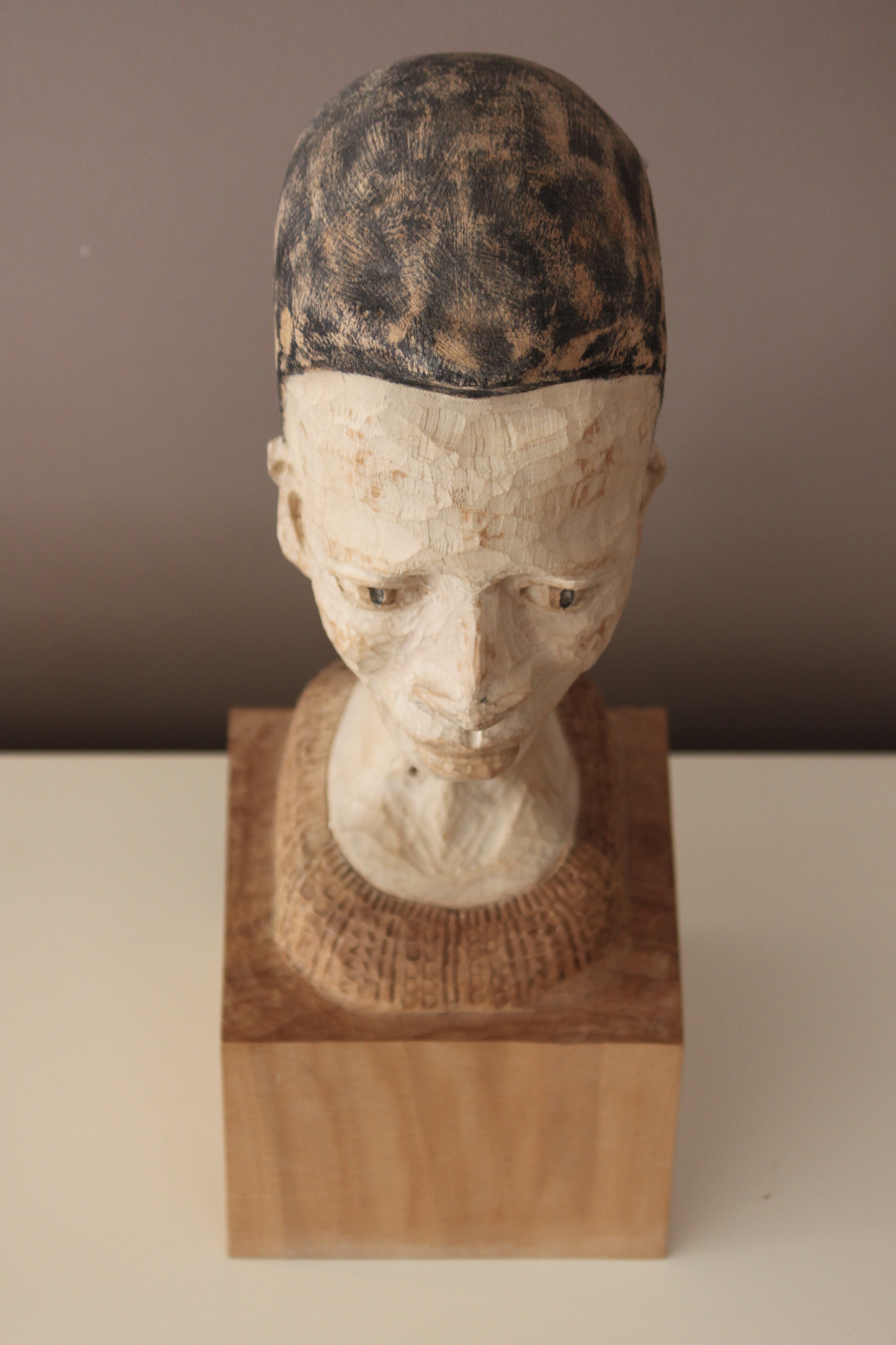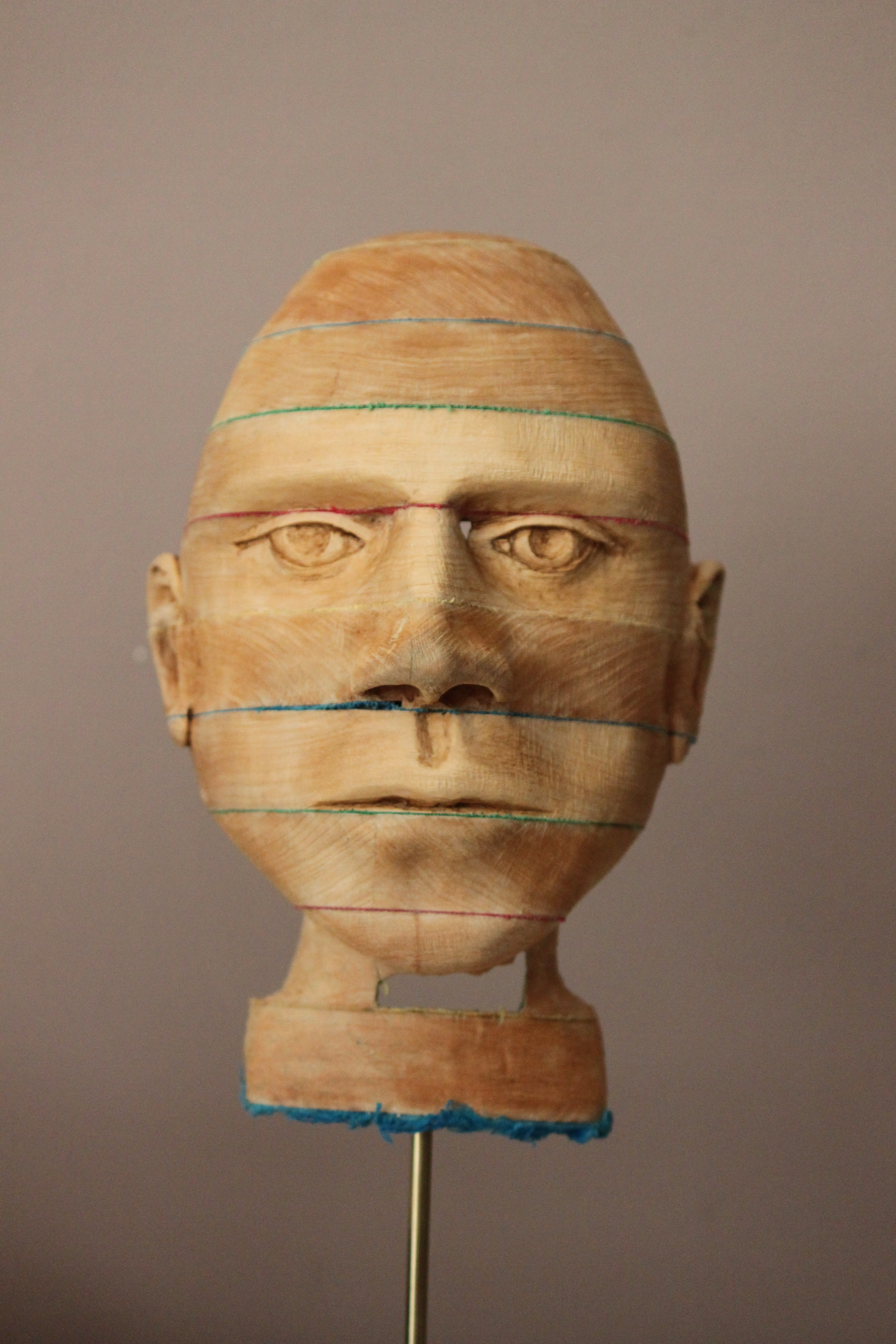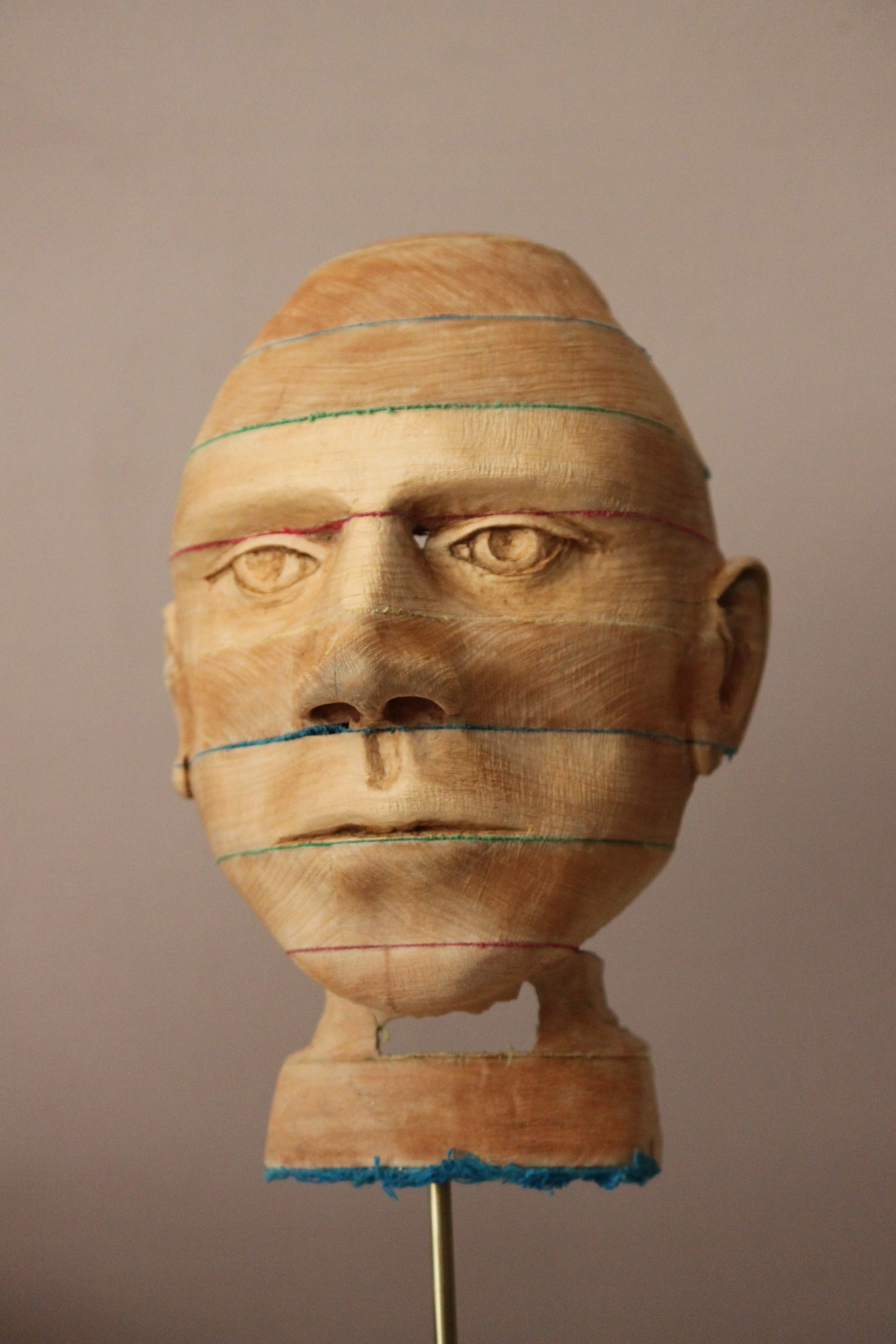 Buste sculpté en merisier et tilleul (chutes) et lin rose, bleu et gris (chutes)
