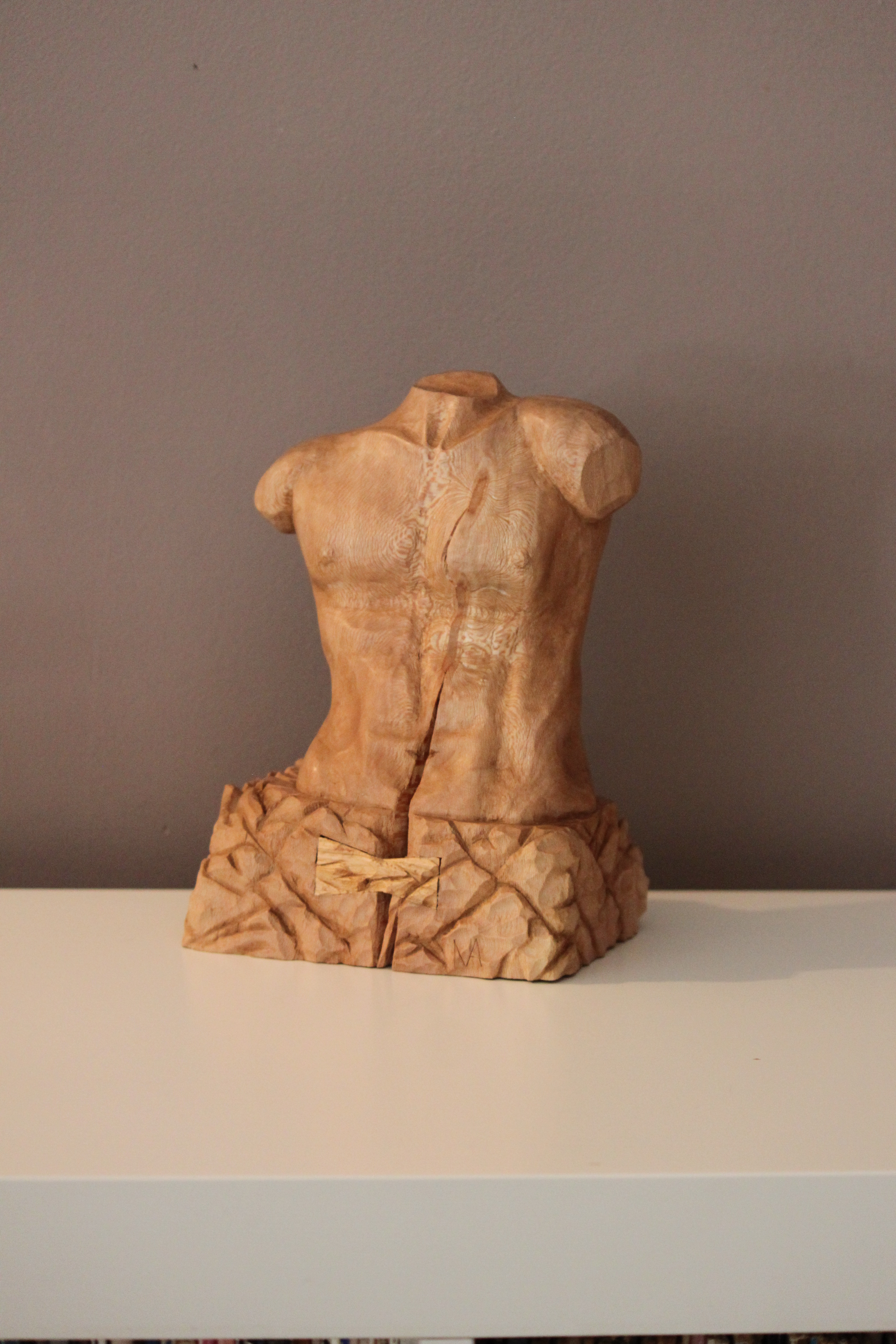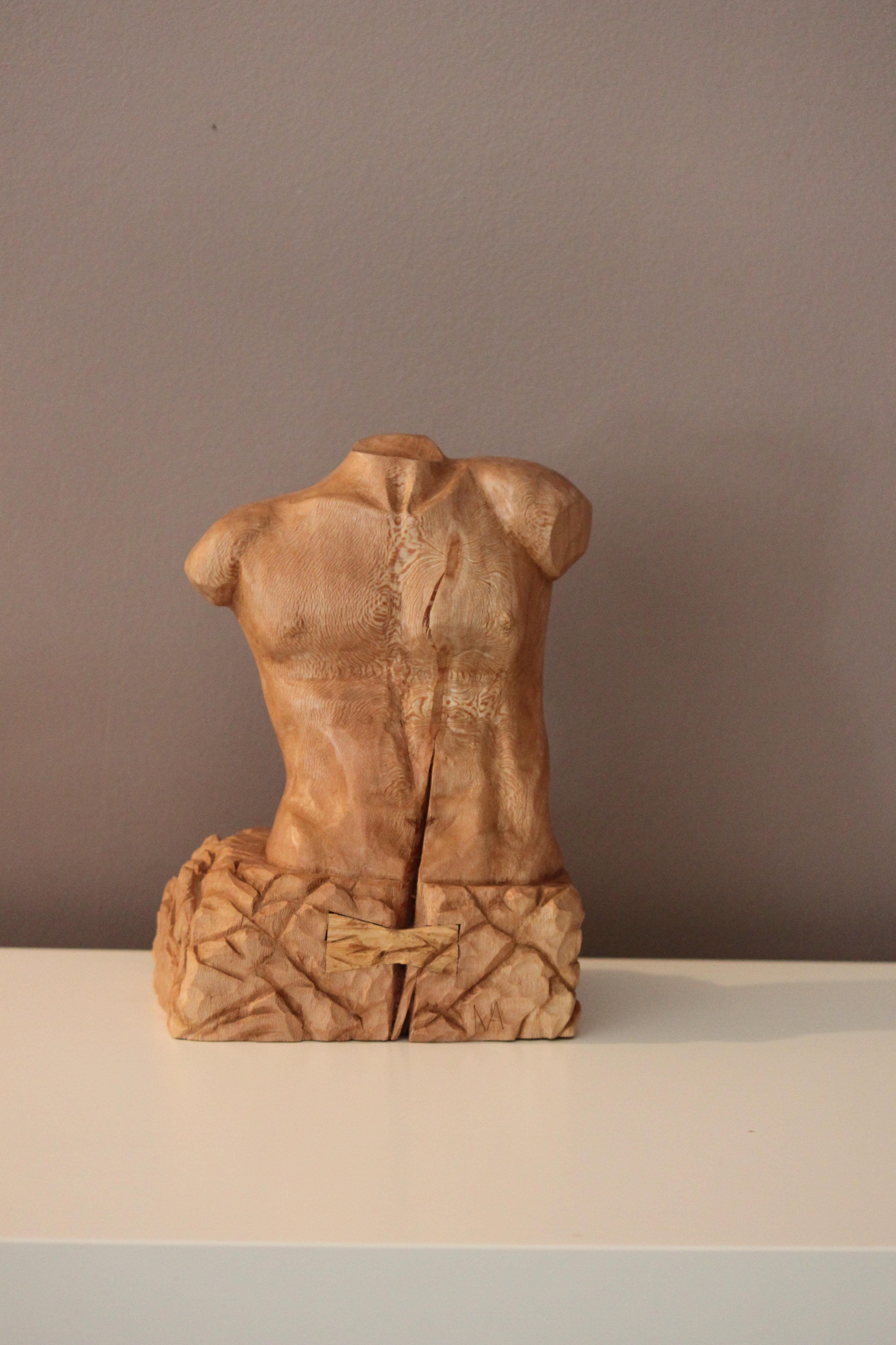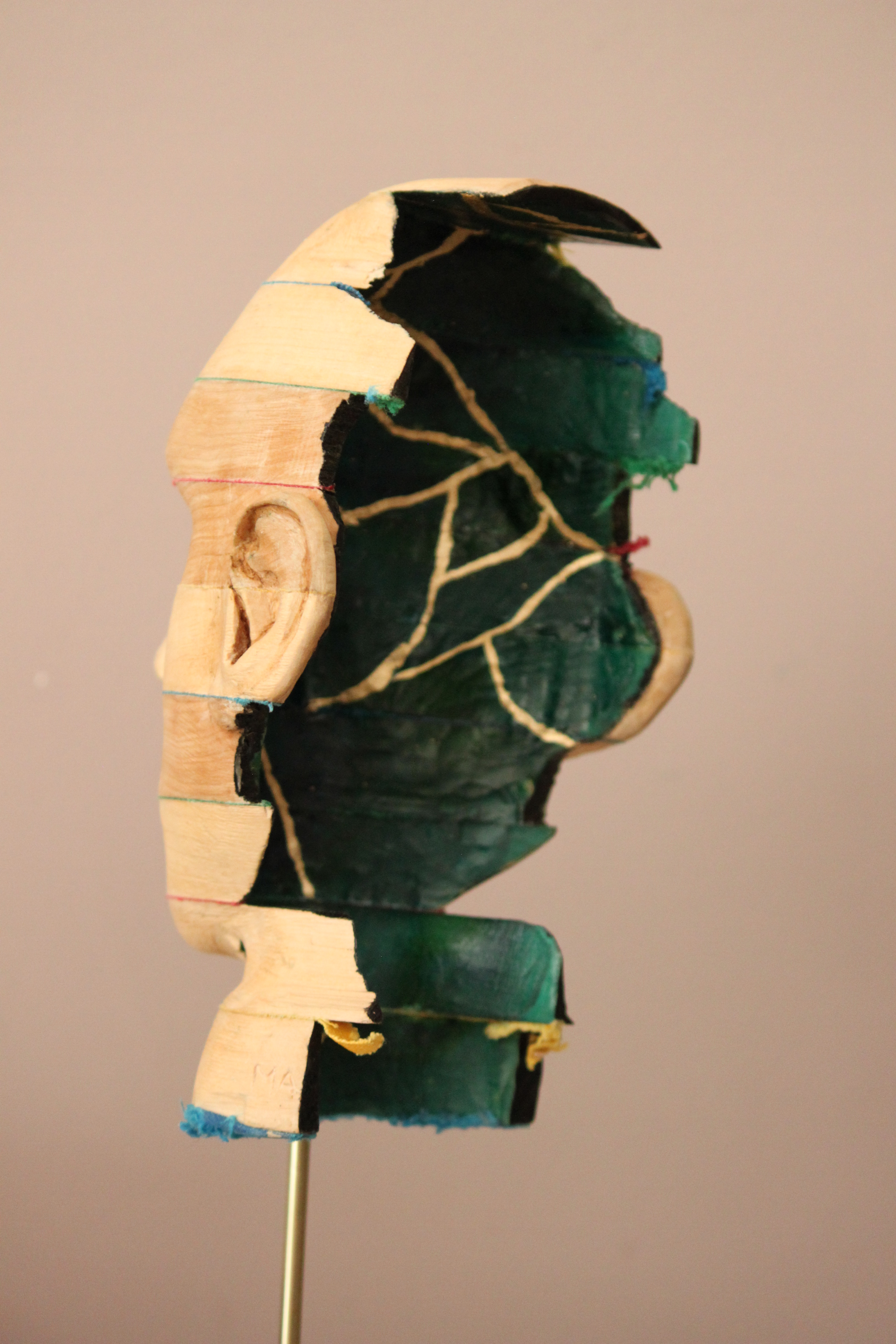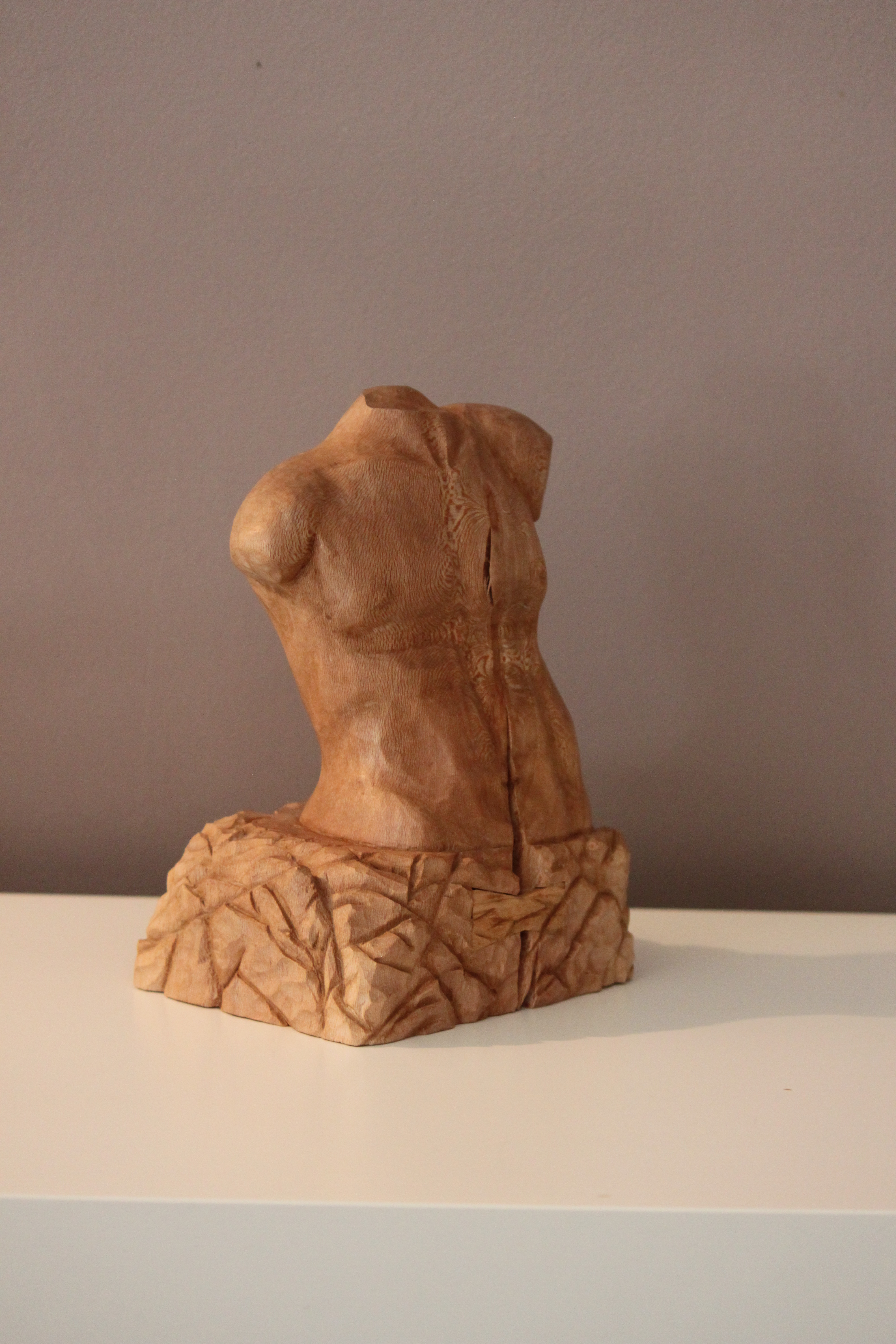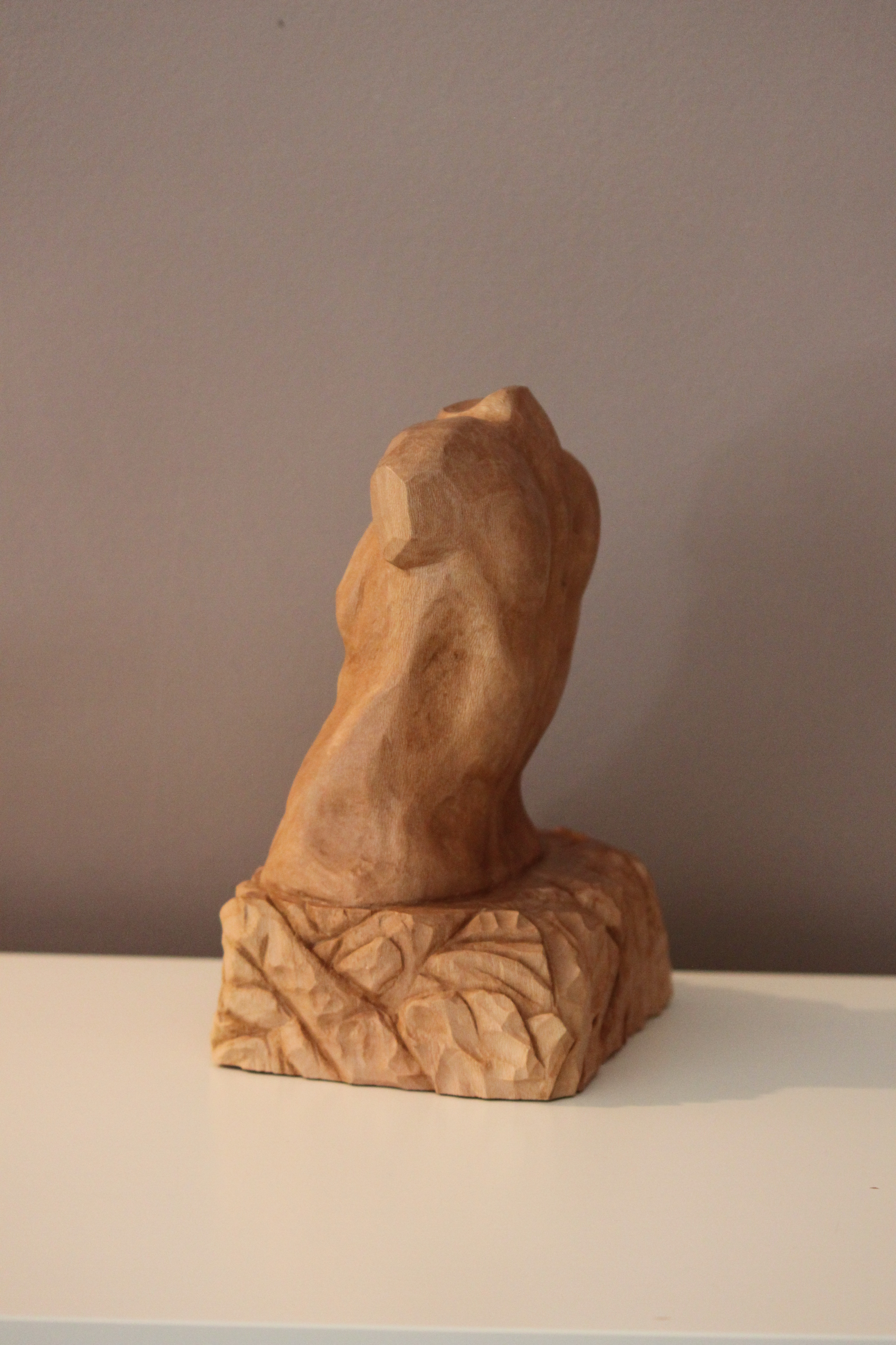 Buste sculpté en merisier et tilleul (chutes) et lin rose, bleu et gris (chutes)