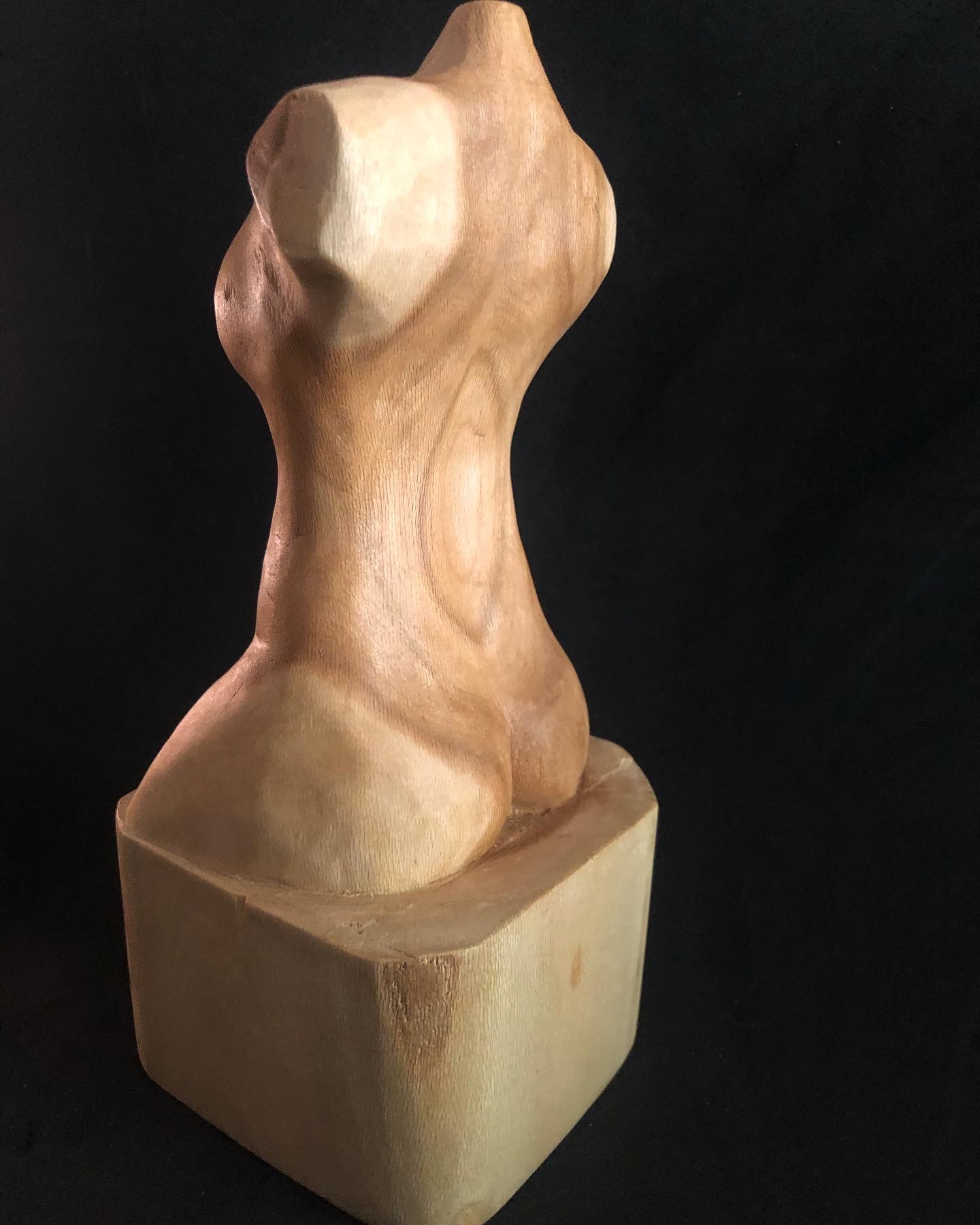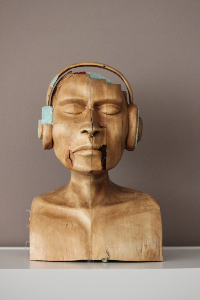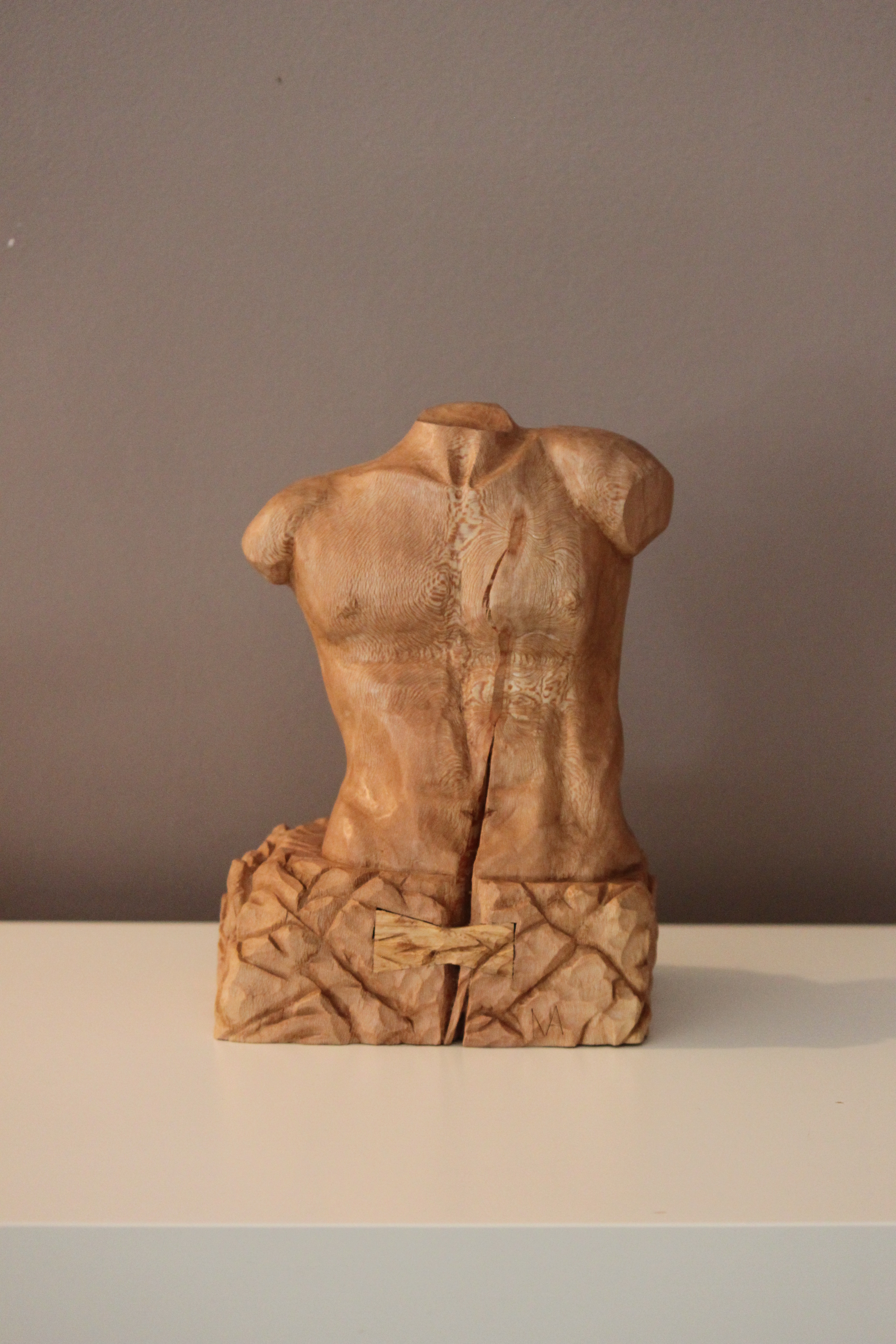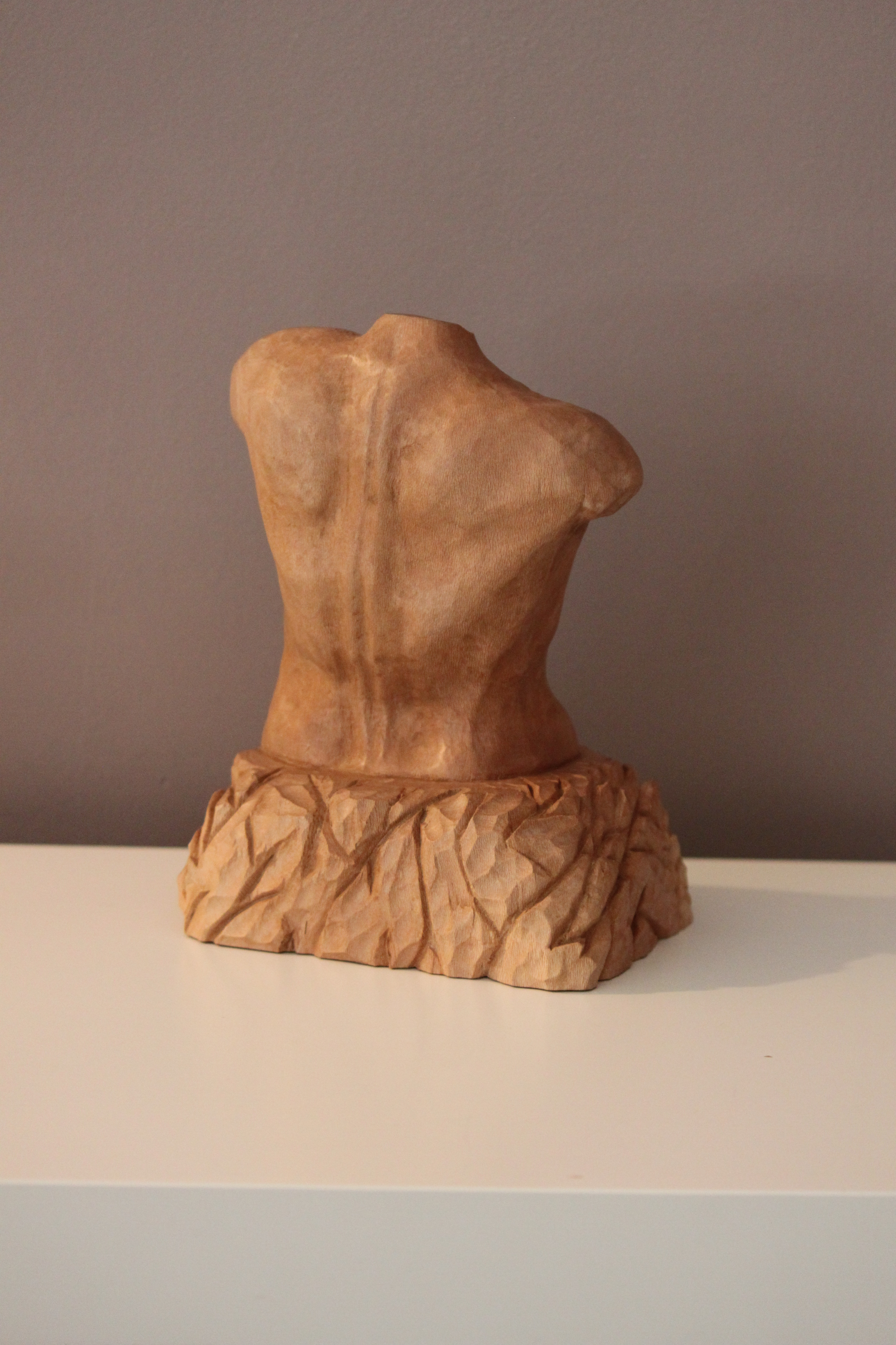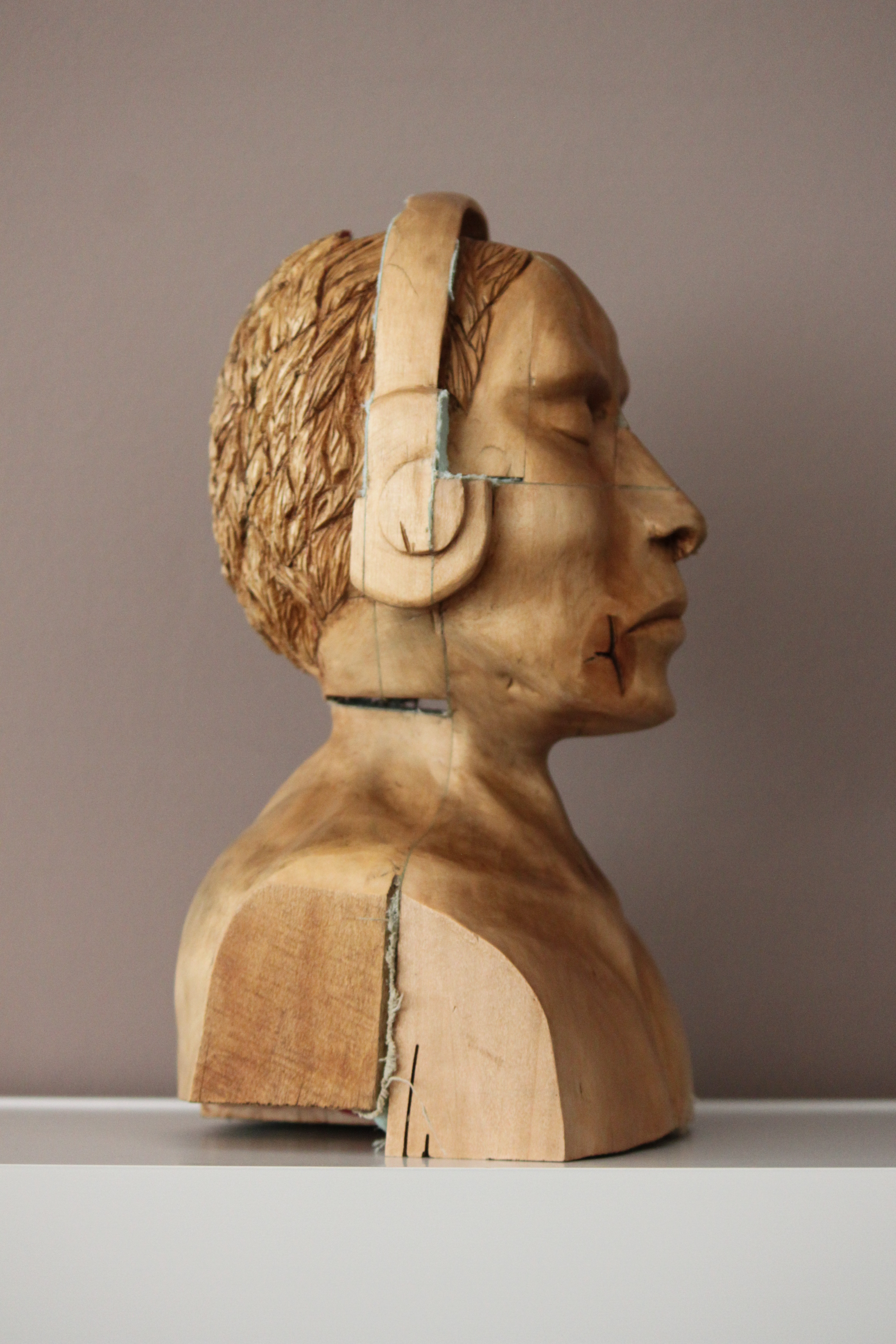 Buste sculpté en merisier et tilleul (chutes) et lin rose, bleu et gris (chutes)