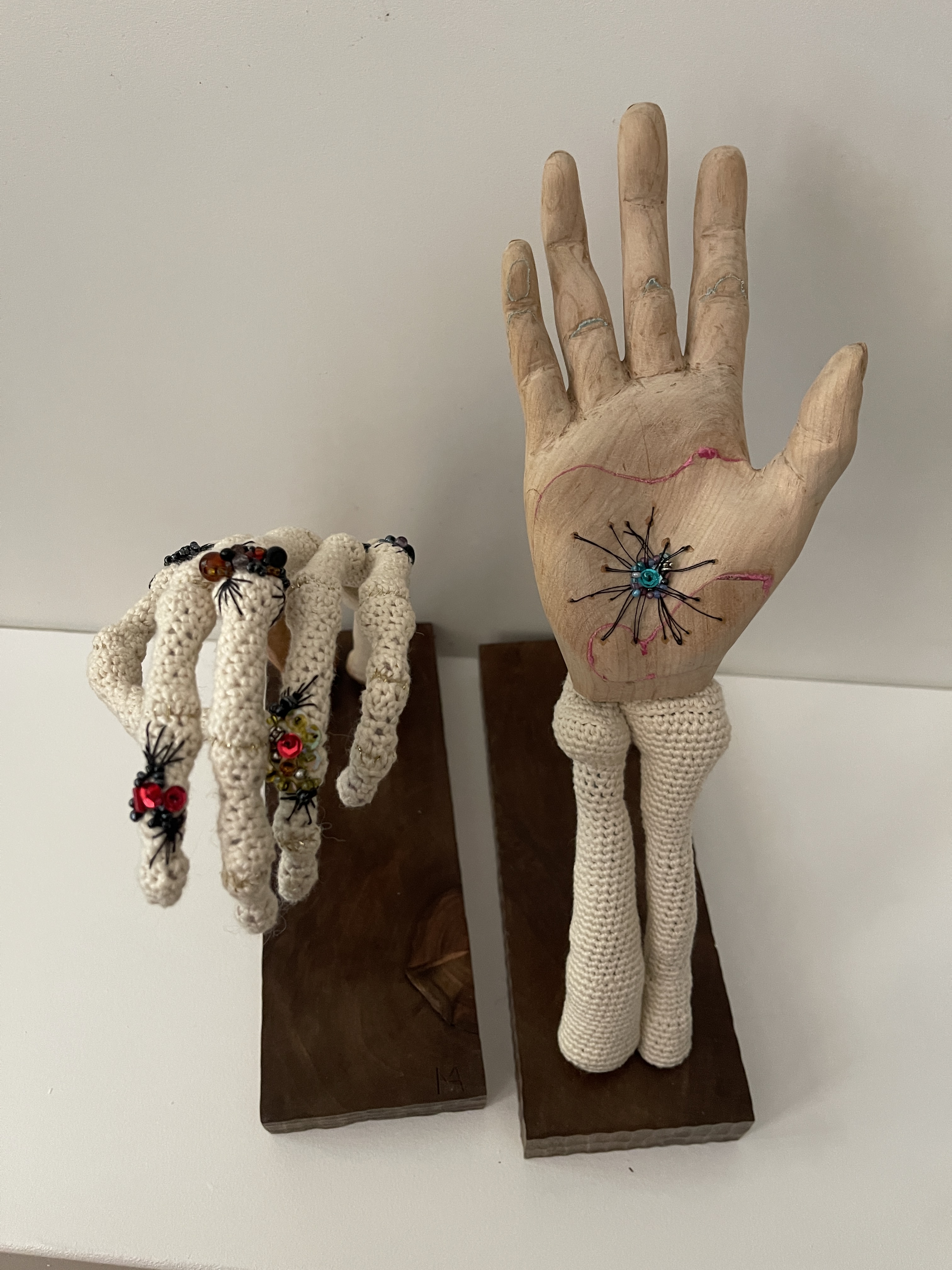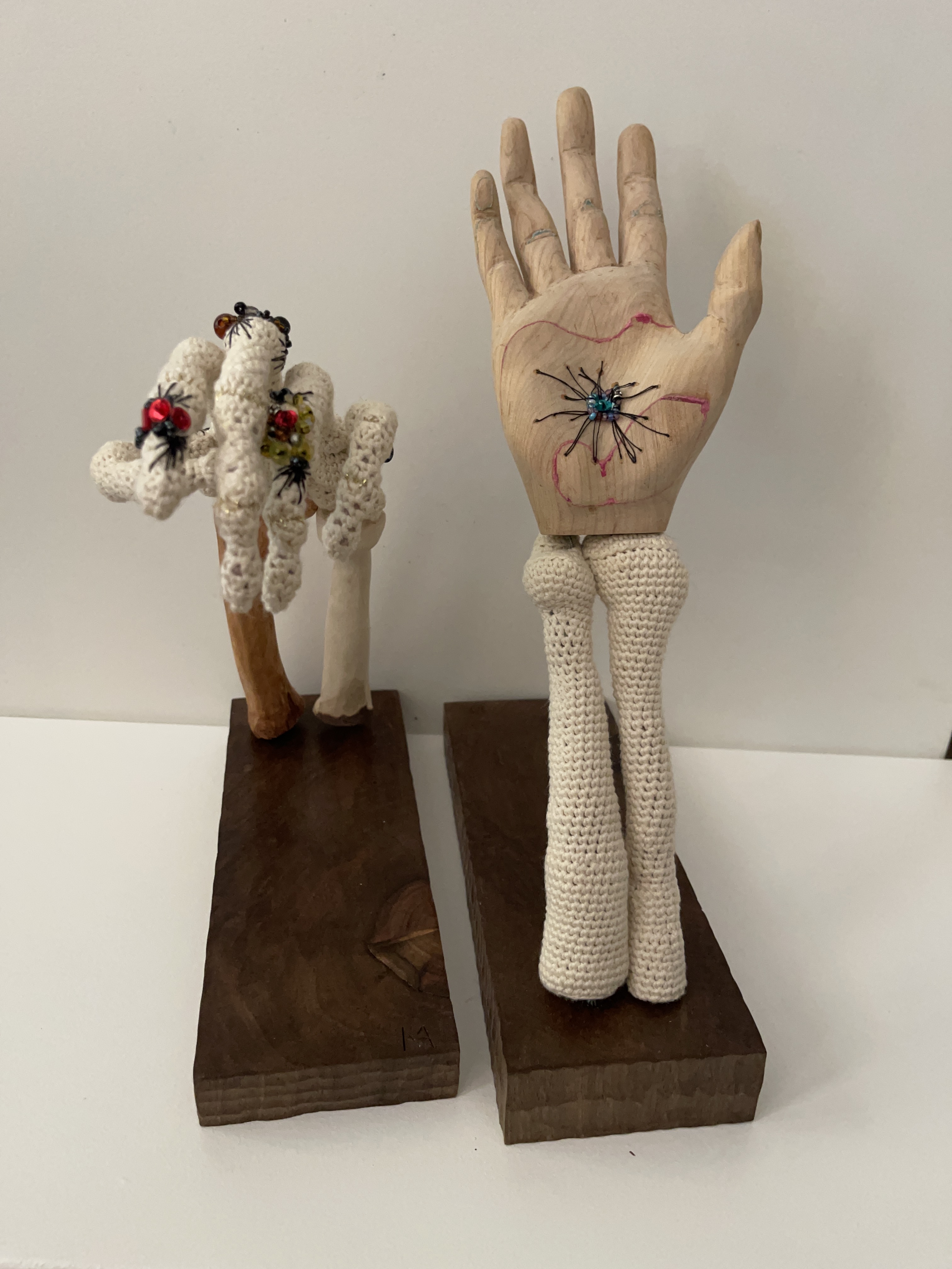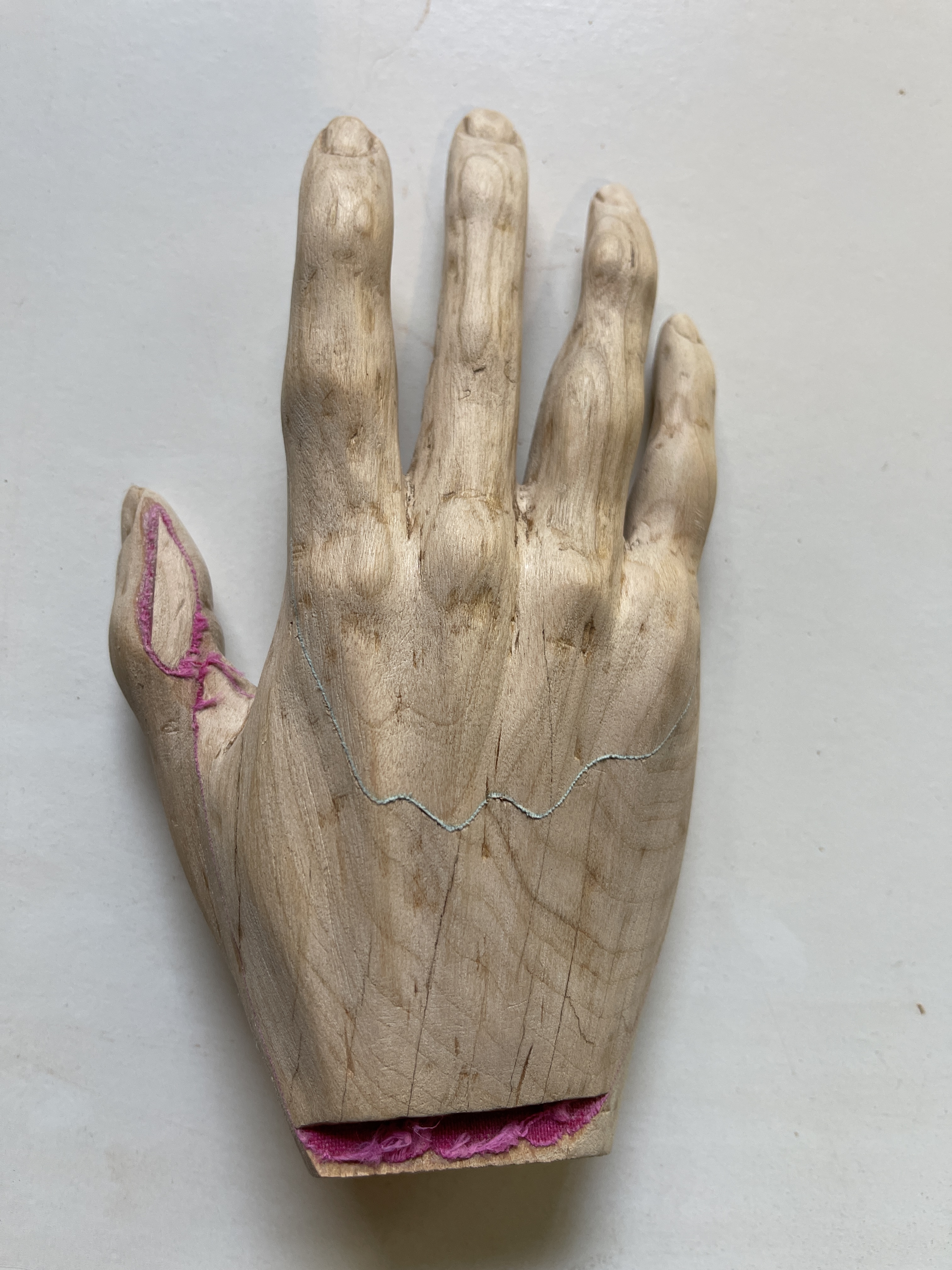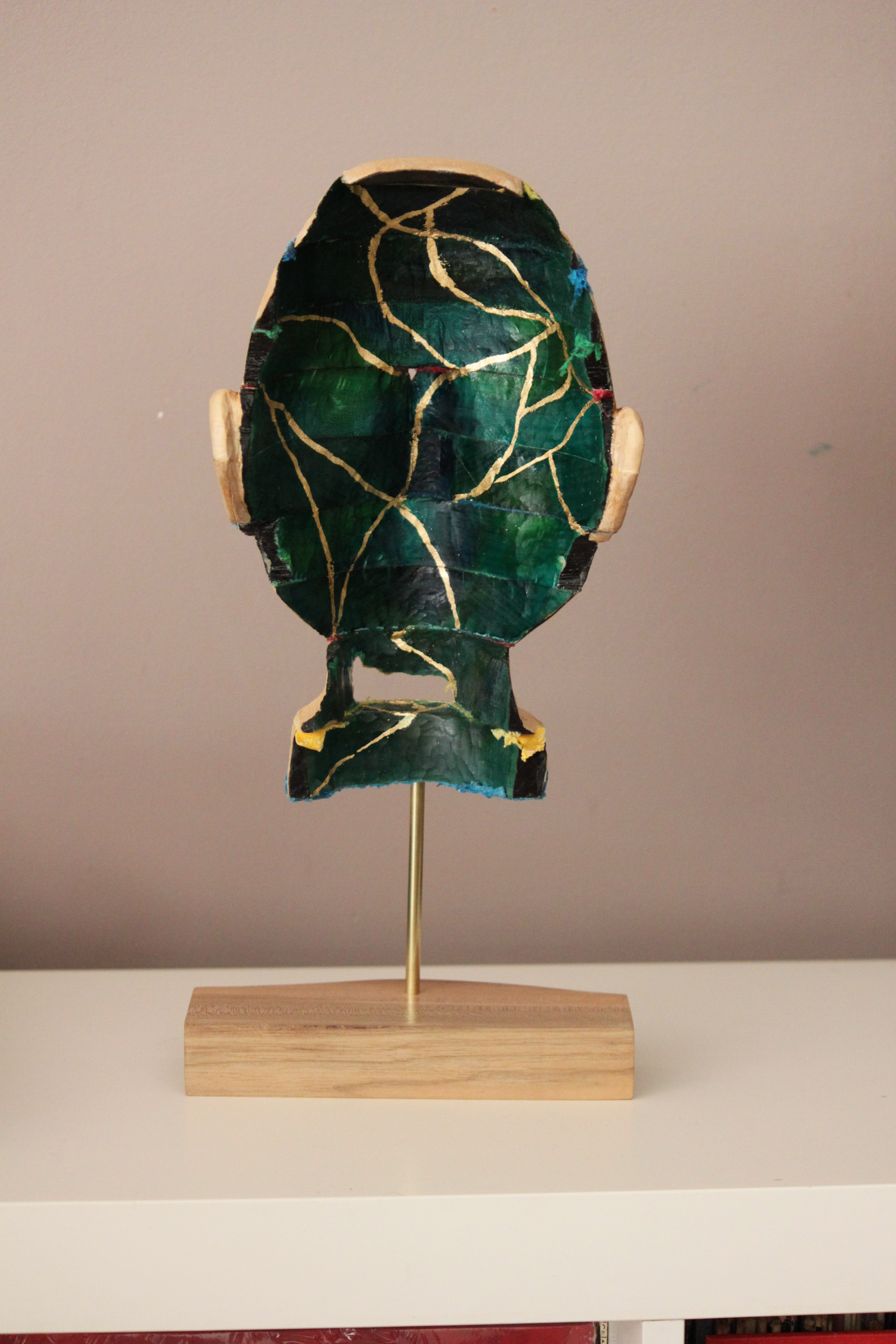 Buste sculpté en merisier et tilleul (chutes) et lin rose, bleu et gris (chutes)