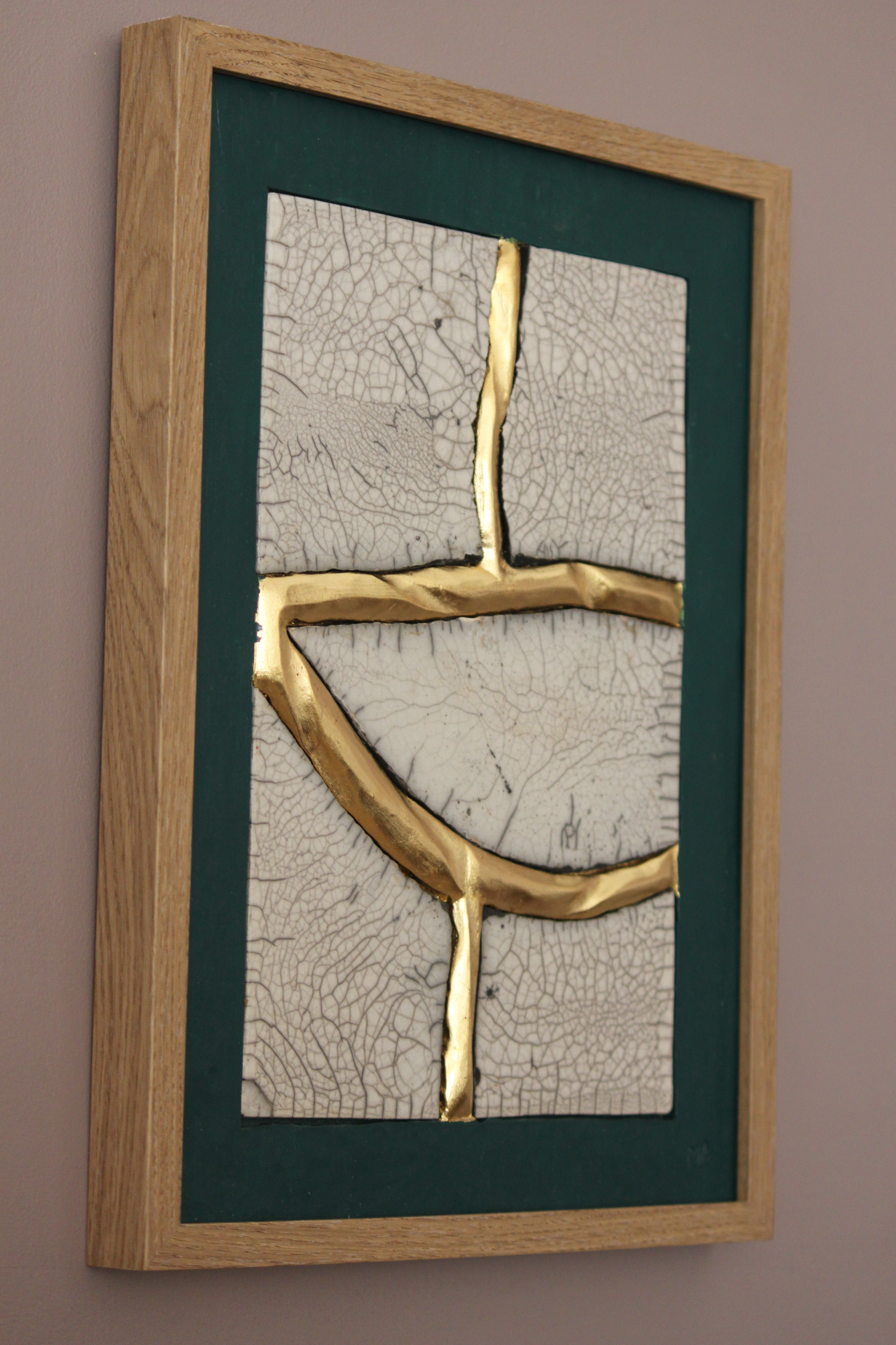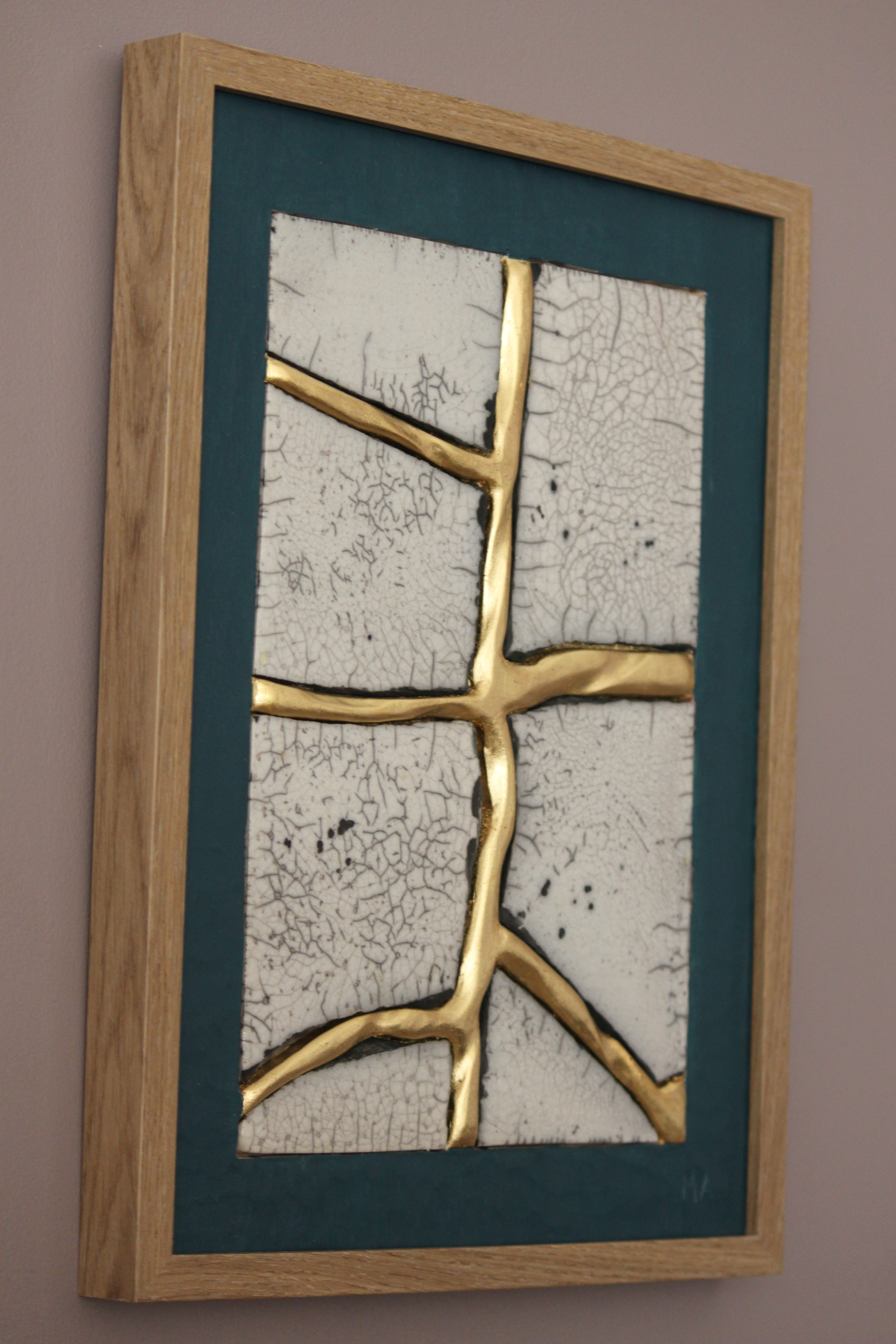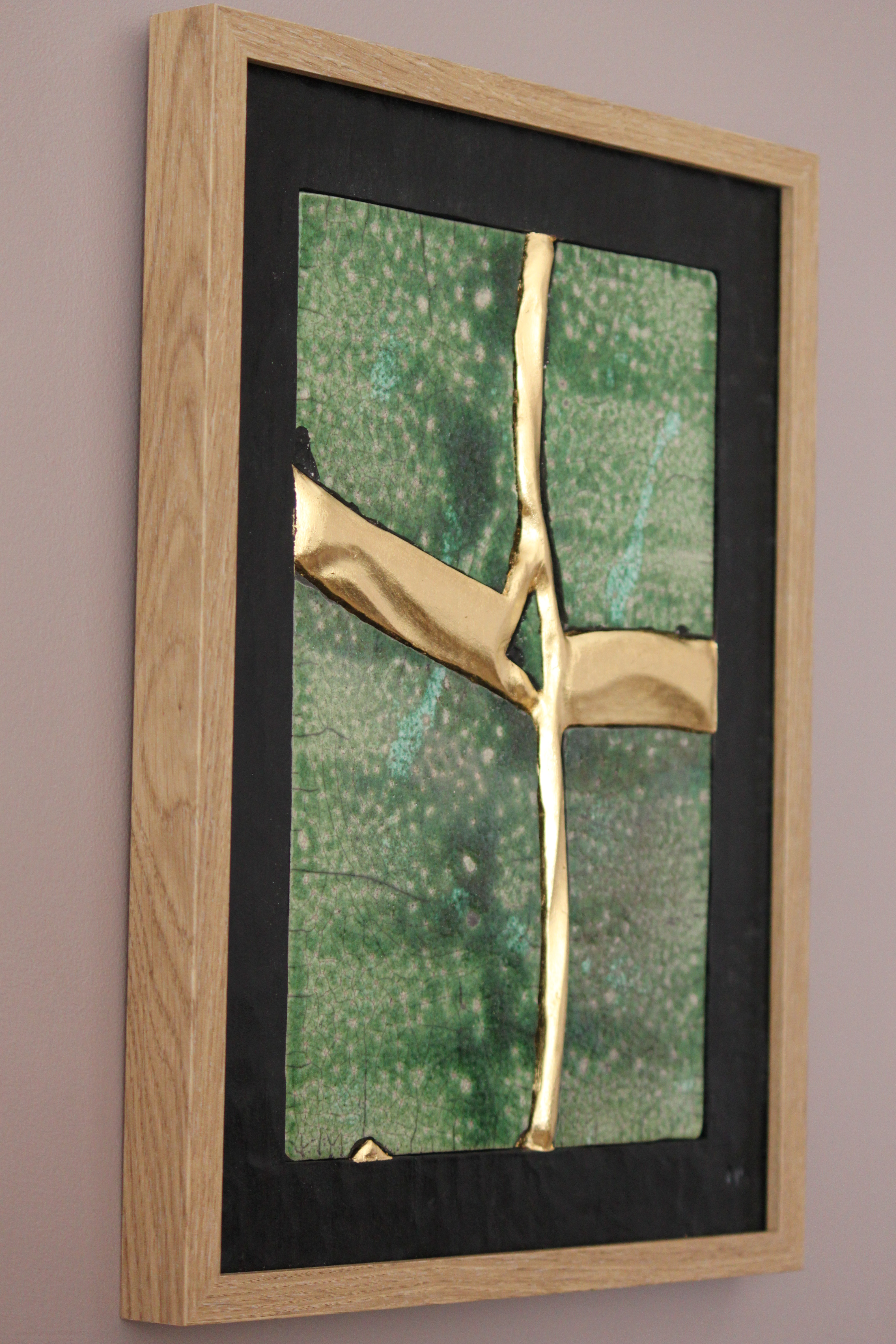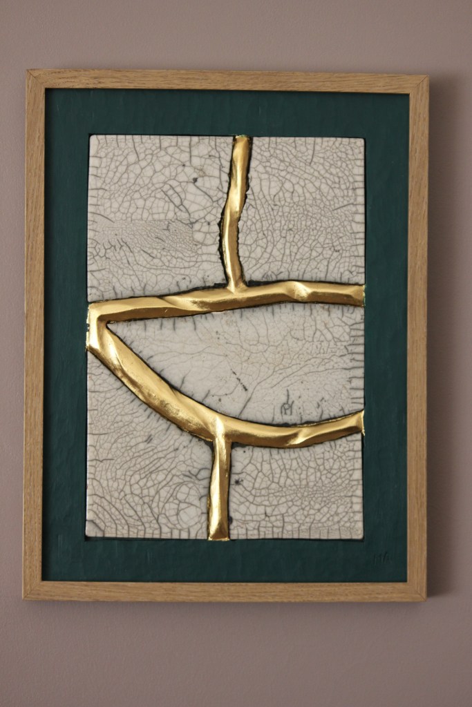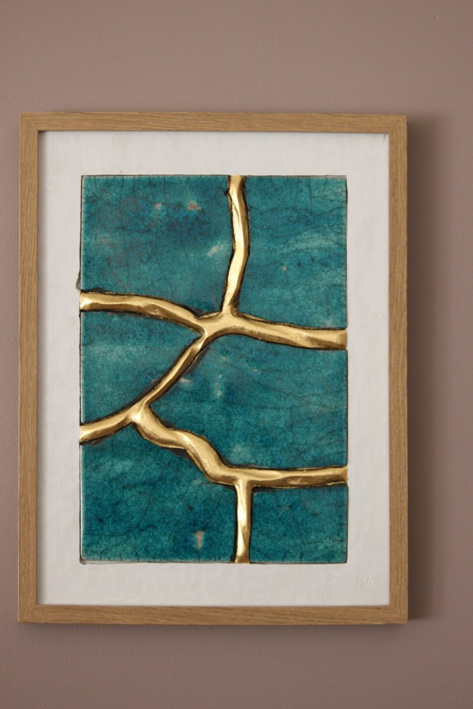 Le concept de résilience est ici exploré sous la forme de cicatrices murales sculptées et dorées à la feuille d’or 23 carats insérées dans des plaques de grès émaillé brisées.