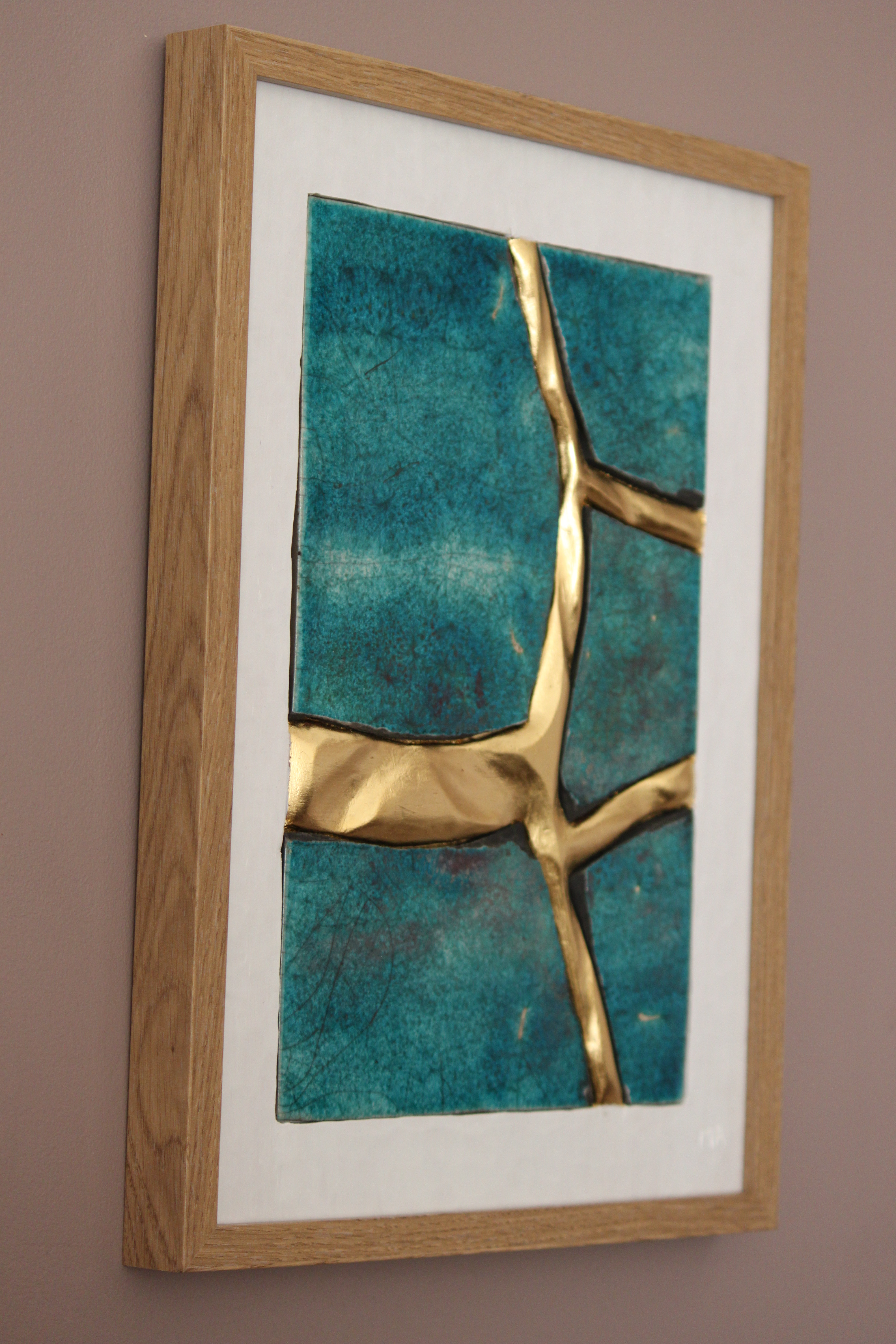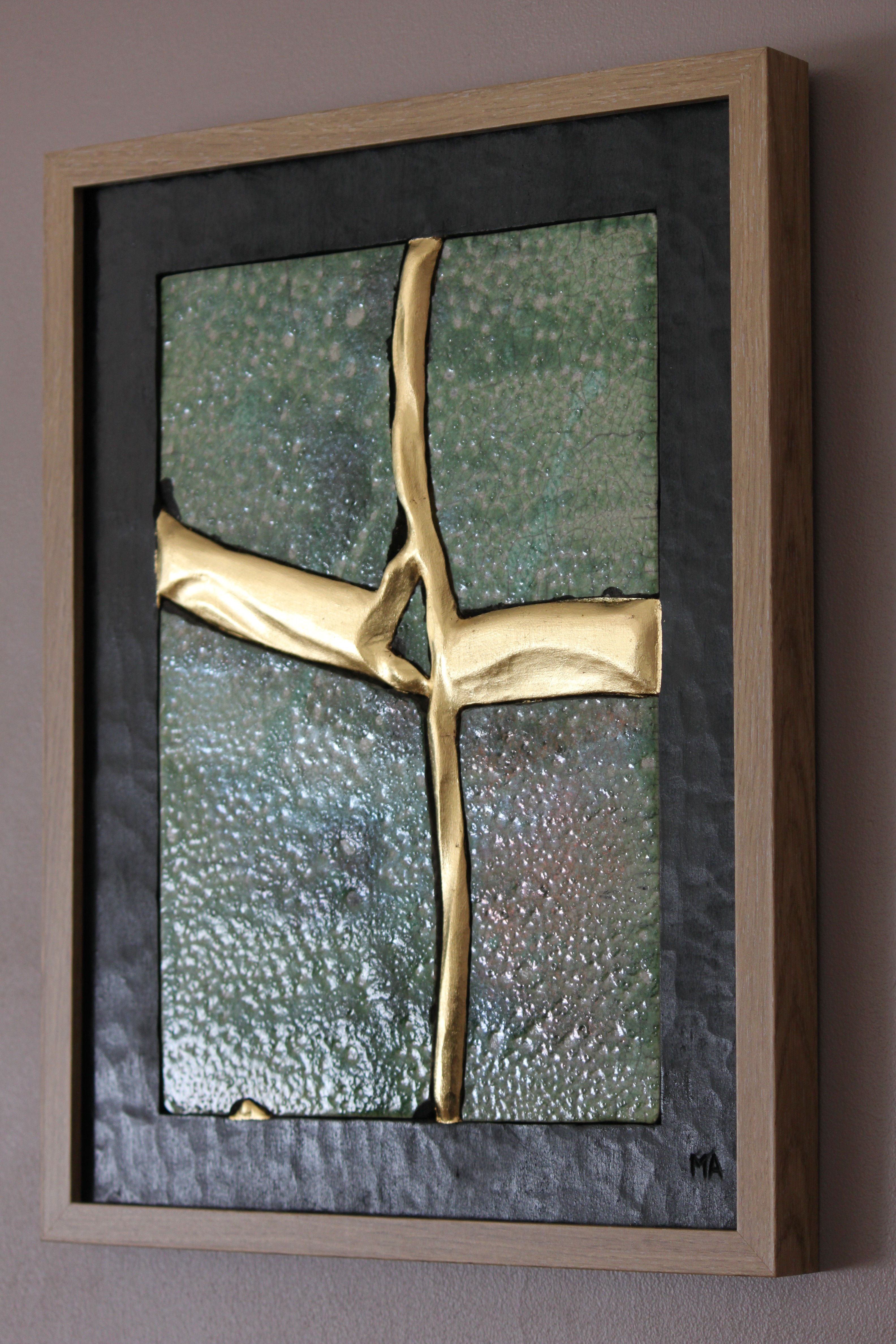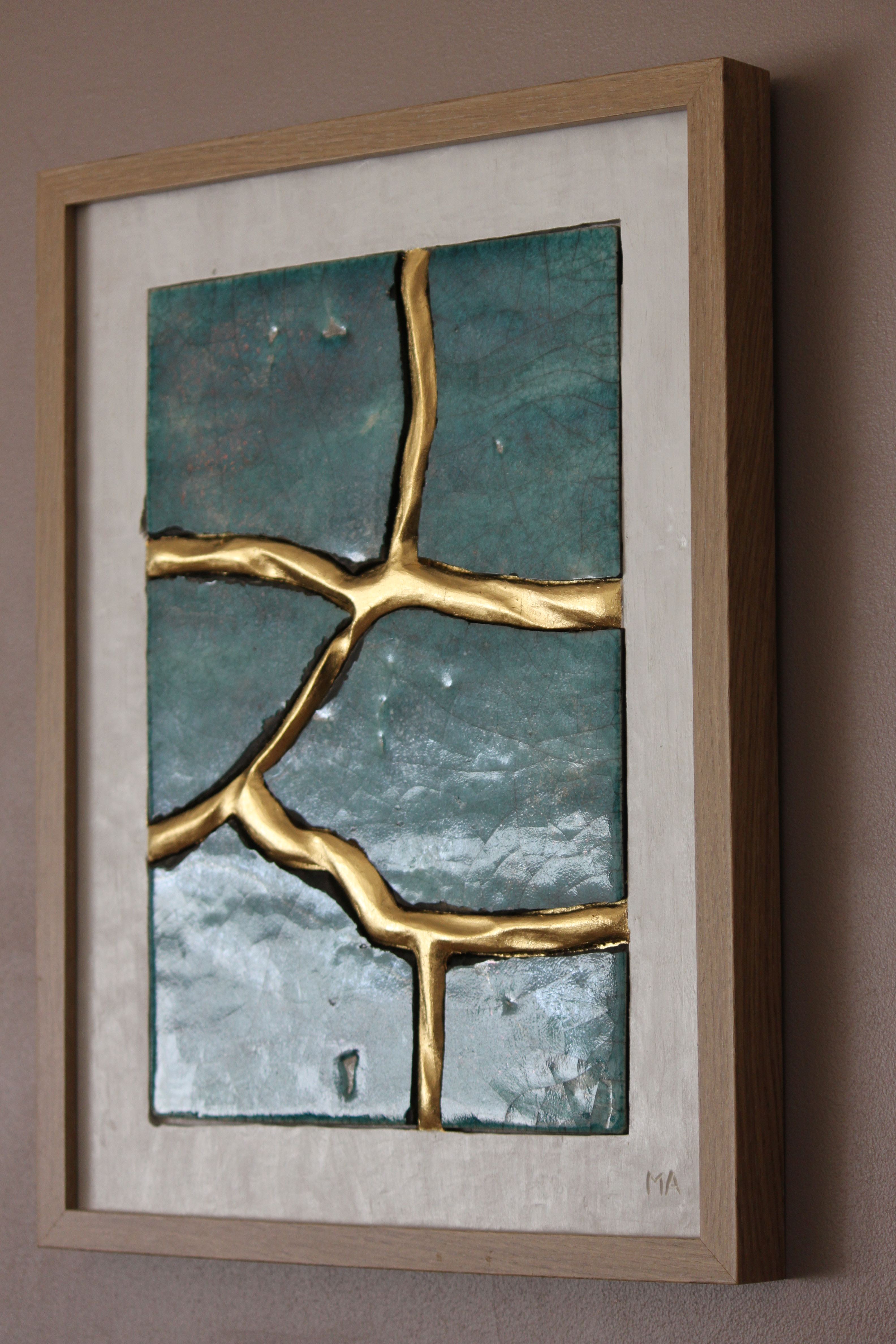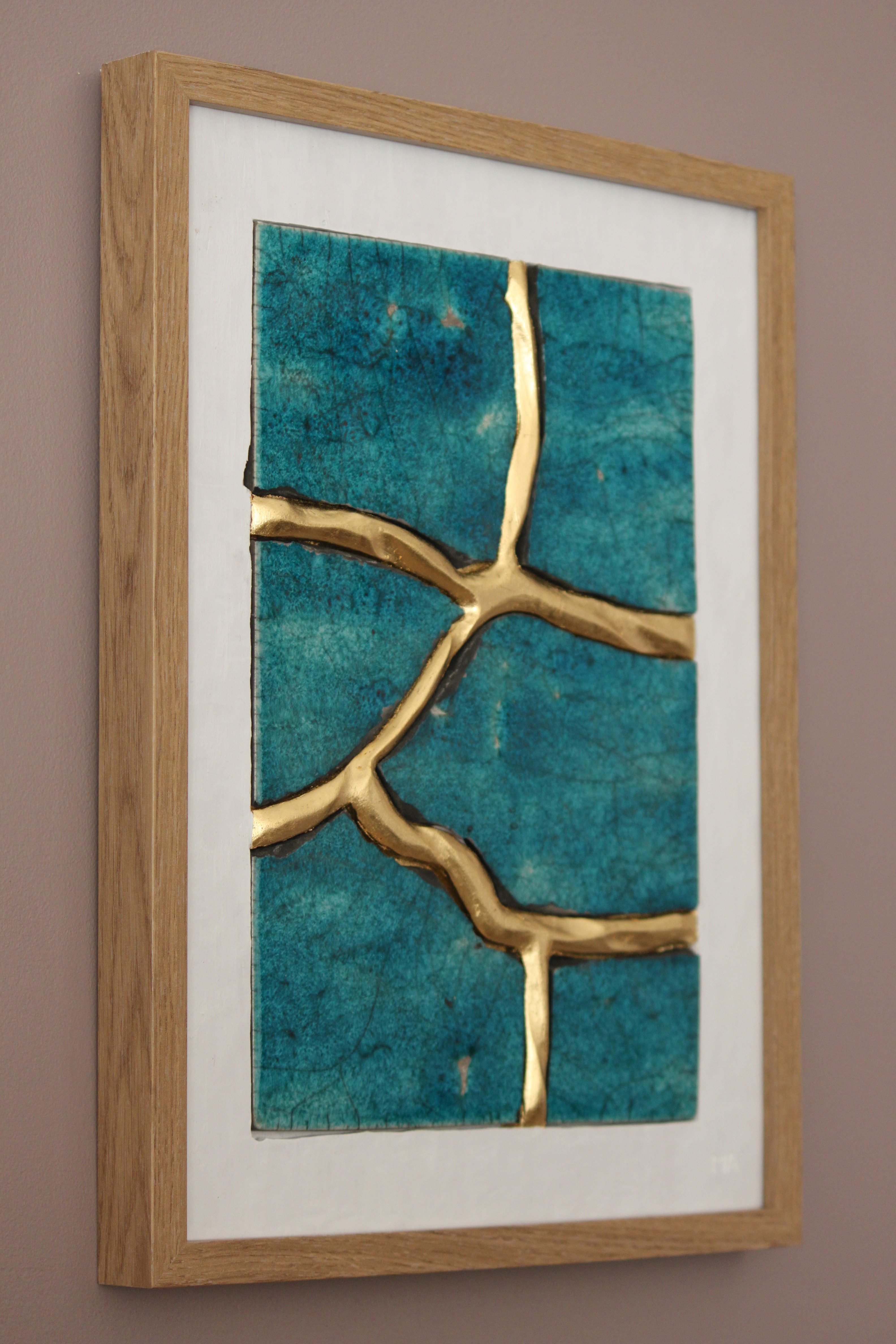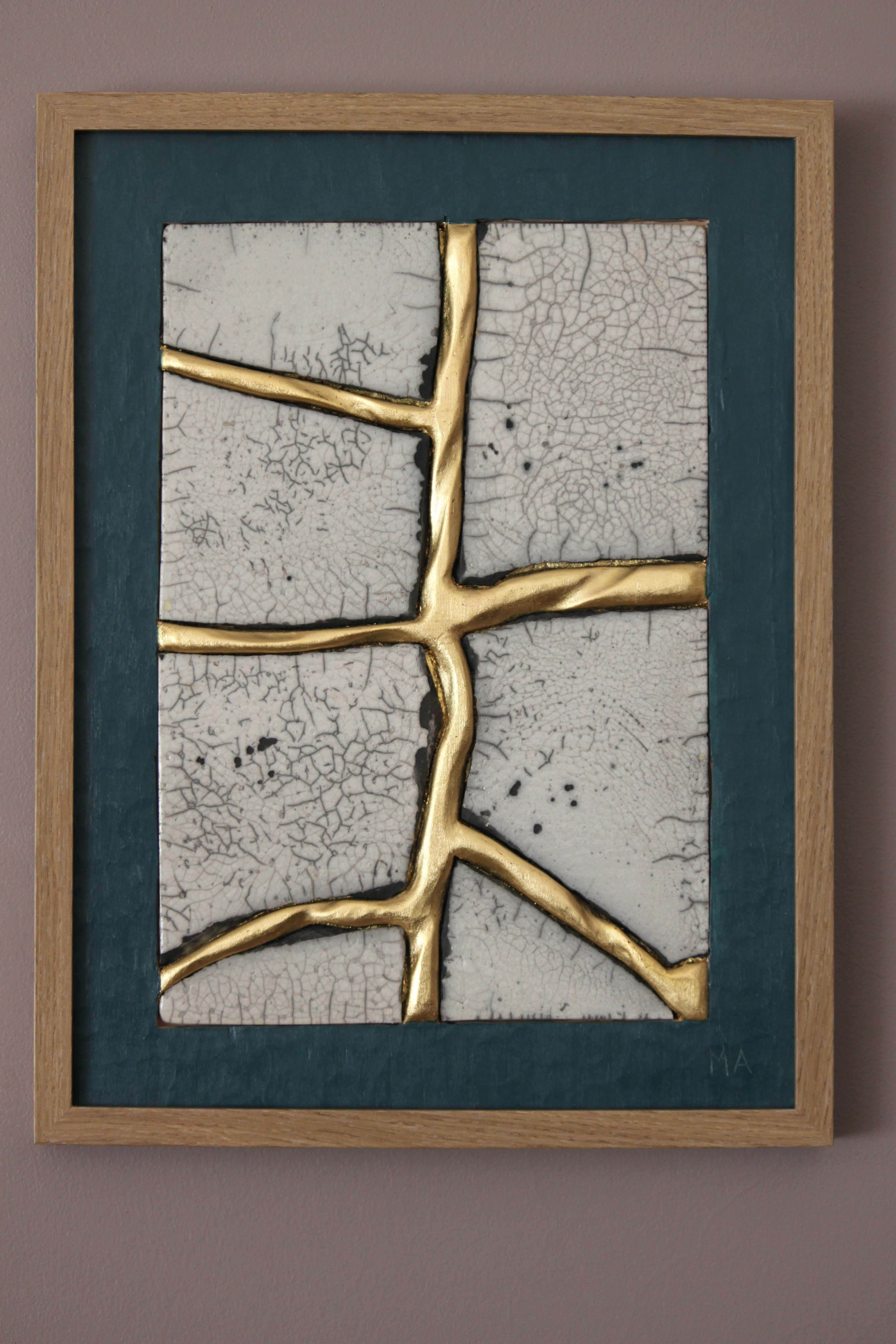 Le concept de résilience est ici exploré sous la forme de cicatrices murales sculptées et dorées à la feuille d’or 23 carats insérées dans des plaques de grès émaillé brisées.