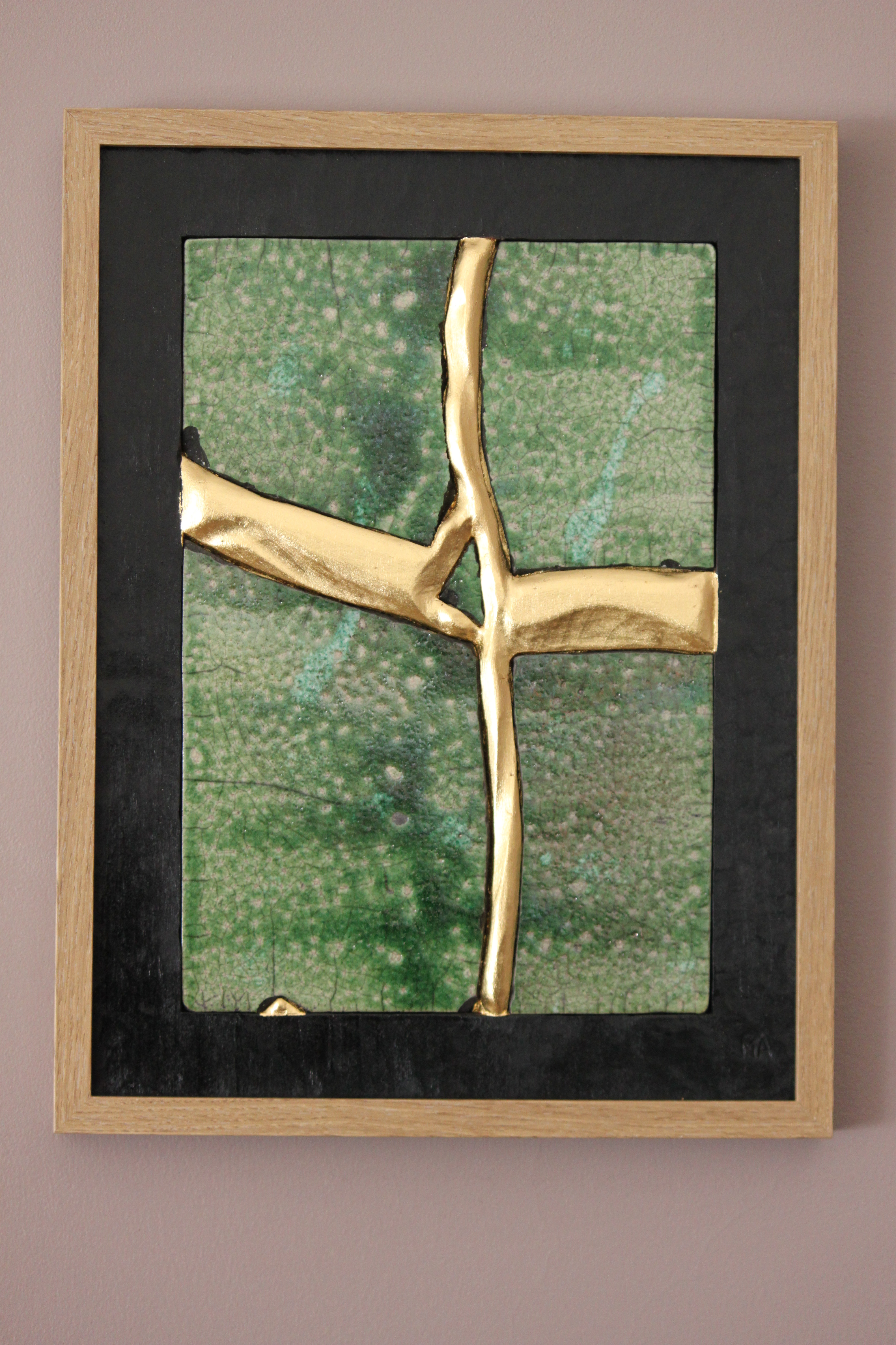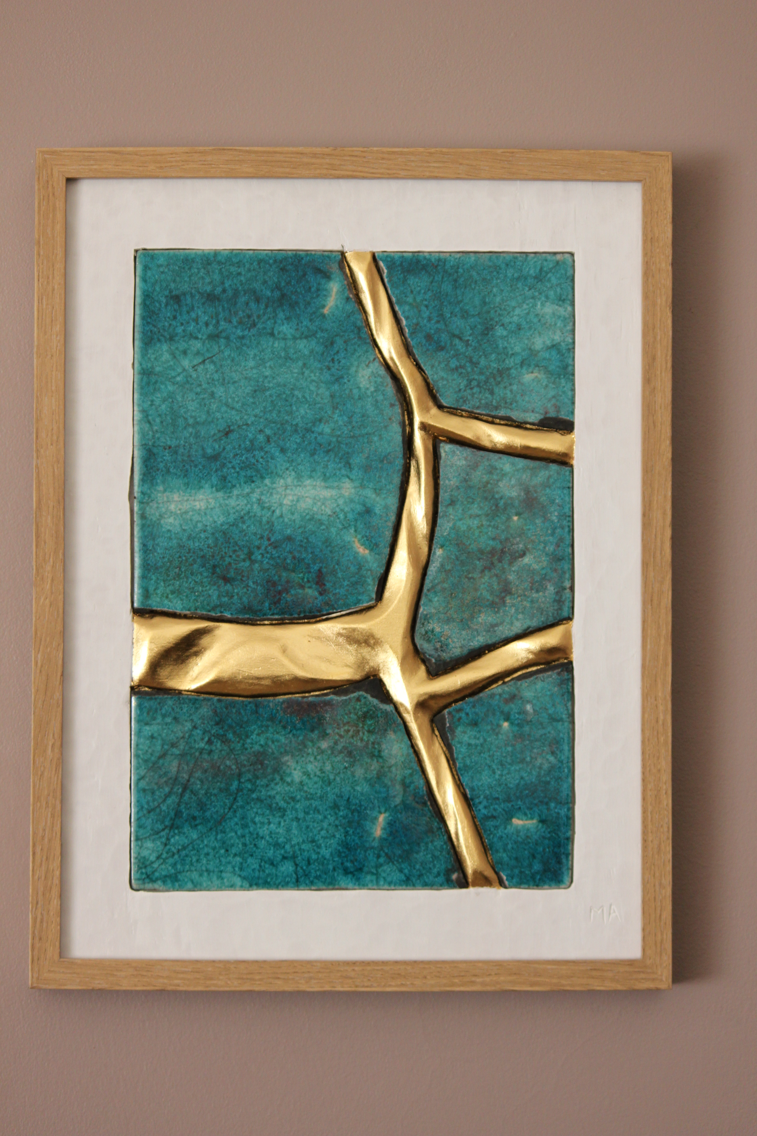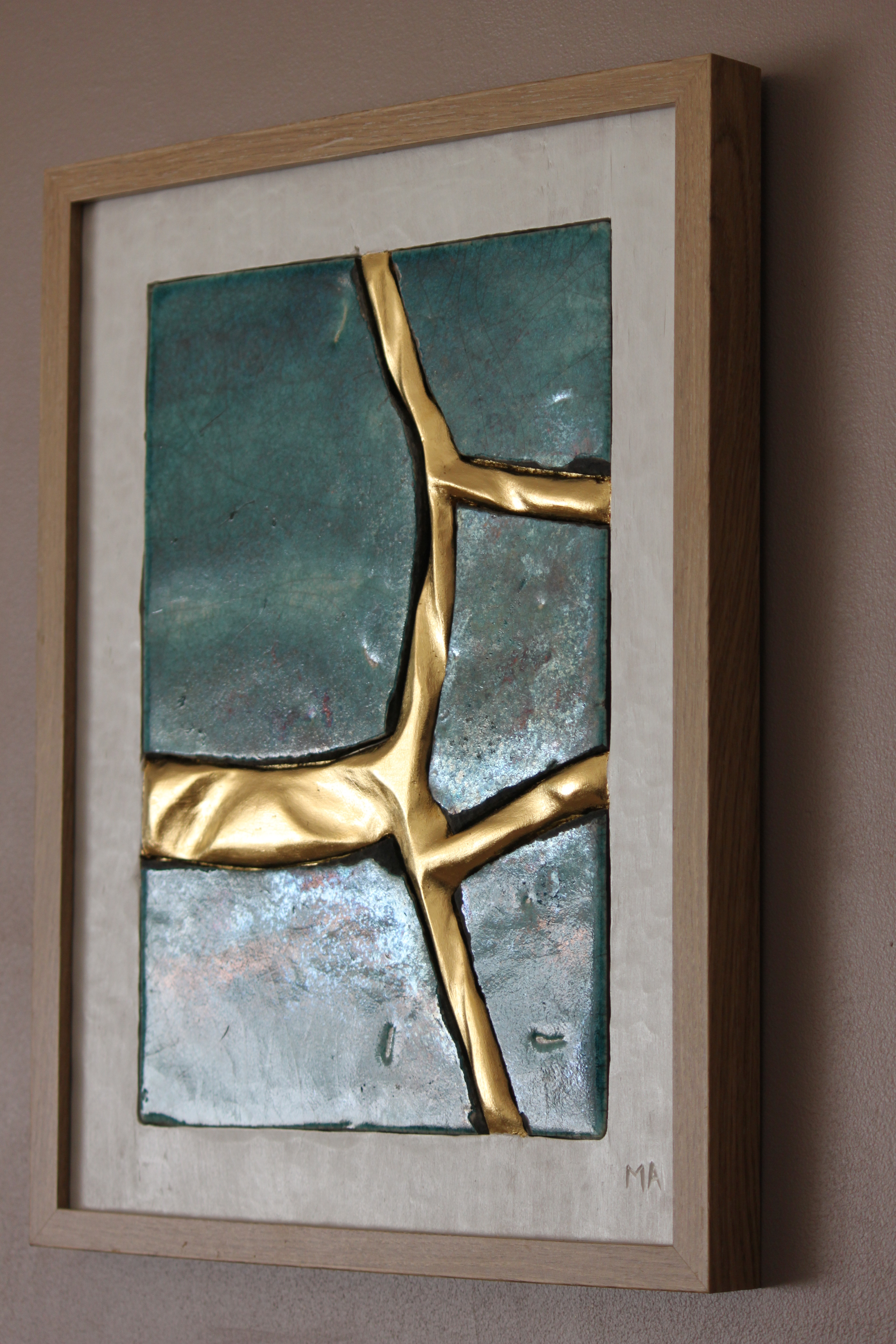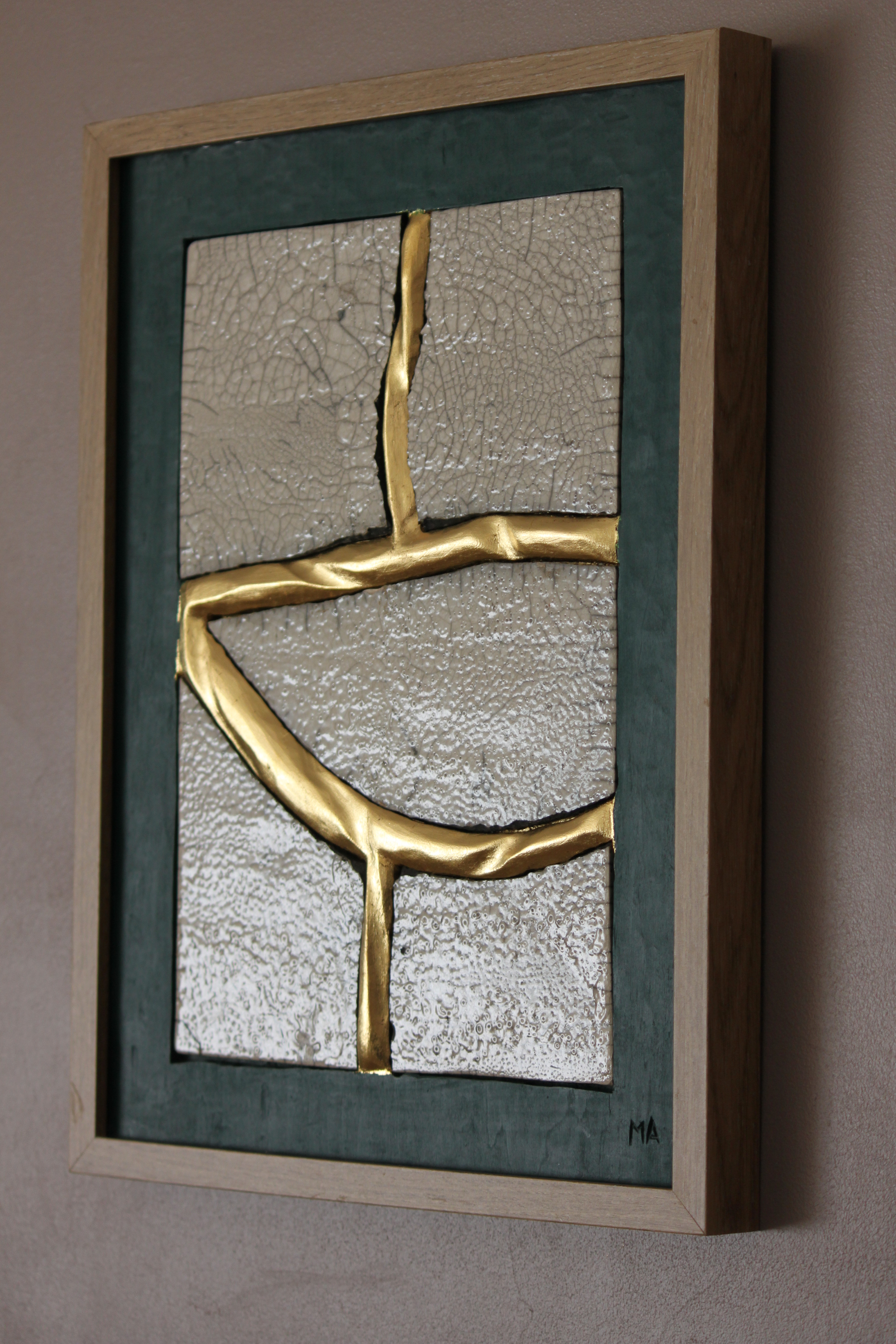 Le concept de résilience est ici exploré sous la forme de cicatrices murales sculptées et dorées à la feuille d’or 23 carats insérées dans des plaques de grès émaillé brisées.